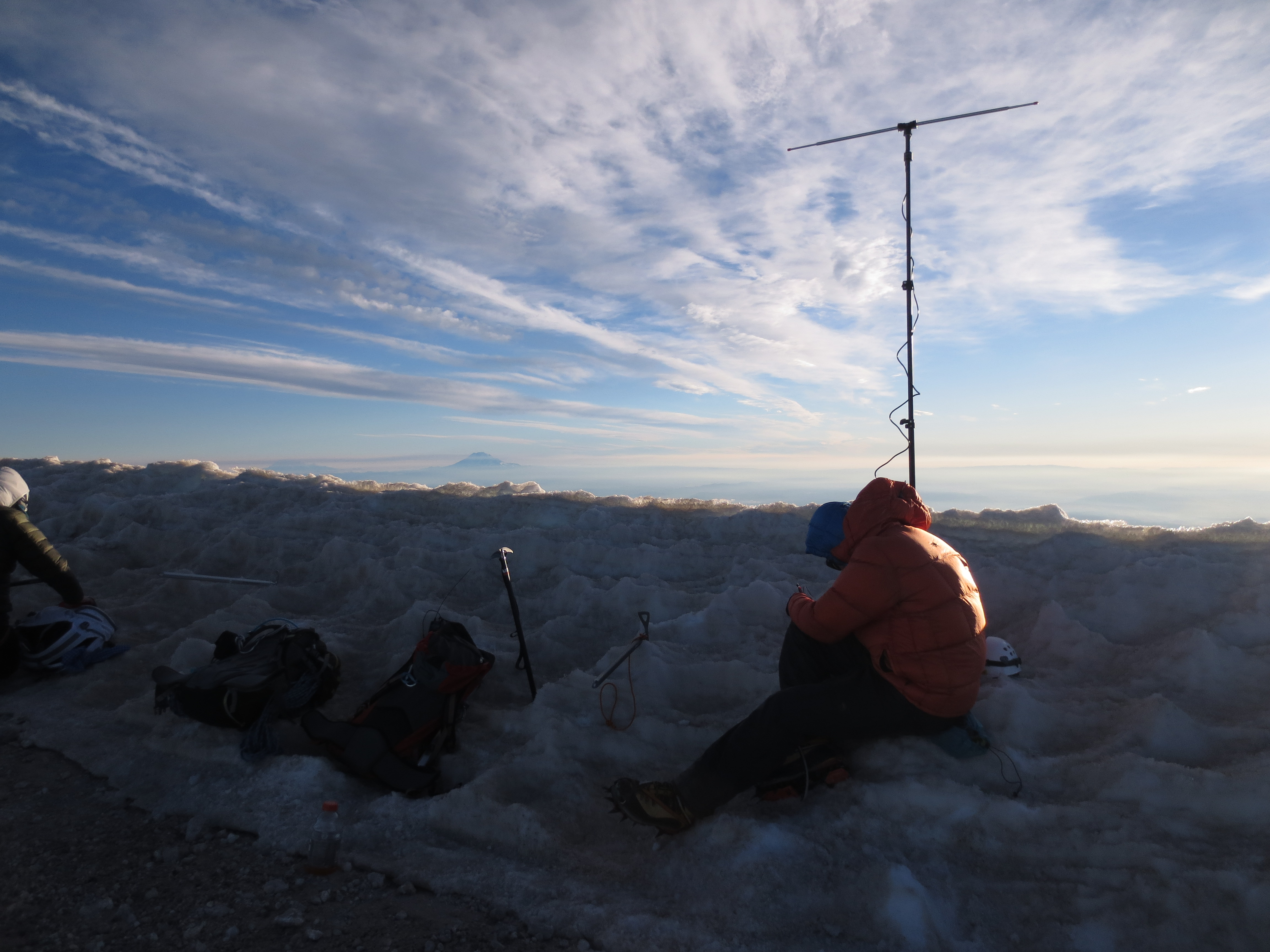 This was a fun activation of Mt. Hood. I decided to splurge on weight and bring the FT-817 and Buddipole (no coils) for 6m and 2m SSB. Once I got the antenna up, I found a number of chasers waiting on 50.125, so I'm glad I brought equipment for 6m. The mast was supported by shoving it into the hard snow on the summit.