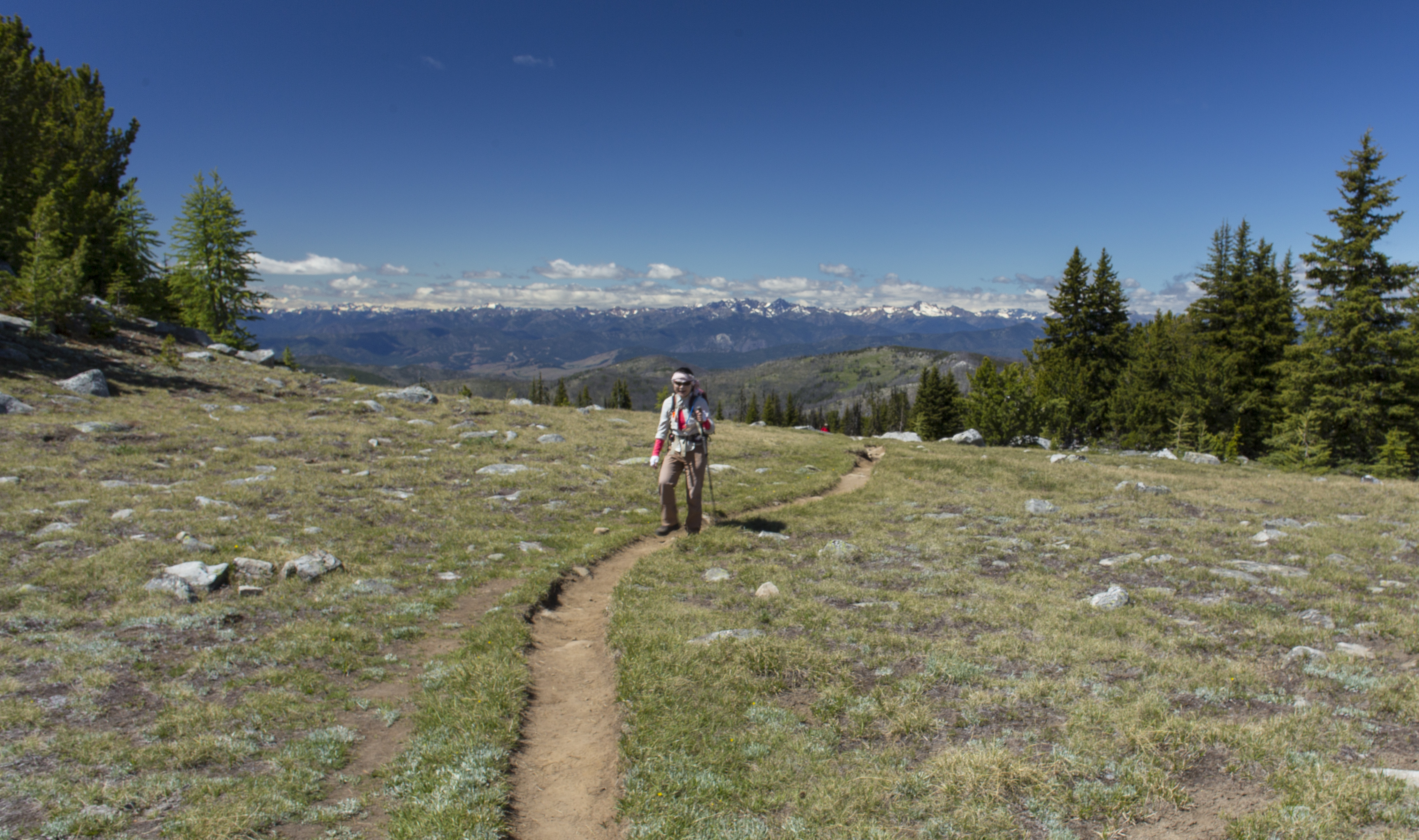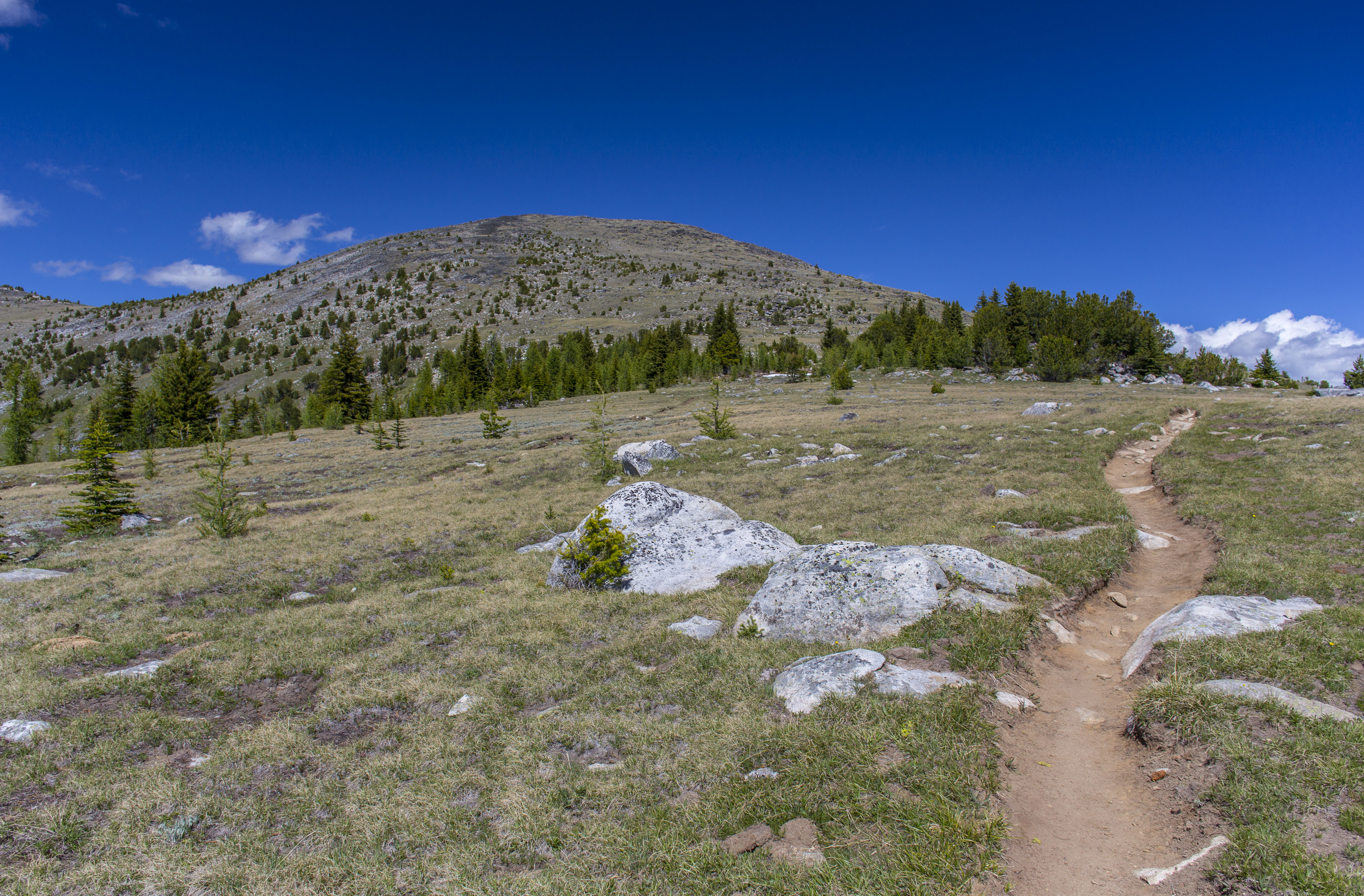 Tiffany Mountain’s 8242 foot summit classifies it as a 10 point SOTA summit. With only a few exceptions, 10 point summits in the W7W association are technical climbs, or exposed Class 3 or 4 scrambles.  Tiffany Mountain offers a well maintained and well graded trail to the summit. Starting with a gentle climb along a sparsely treed ridge, the trail gradually makes it way to a large grassy meadow about 1.5 miles into the hike. From the meadows, the wide rocky topped summit is viewed. The trail makes its way across the meadow to the base of the summit area, and then switchbacks several times to obtain the broad summit ridge. A few small trees decorate the summit block and ridge. Remains of a metal pole make the perfect anchor for attaching an antenna pole. The summit views are expansive 360 degree views.