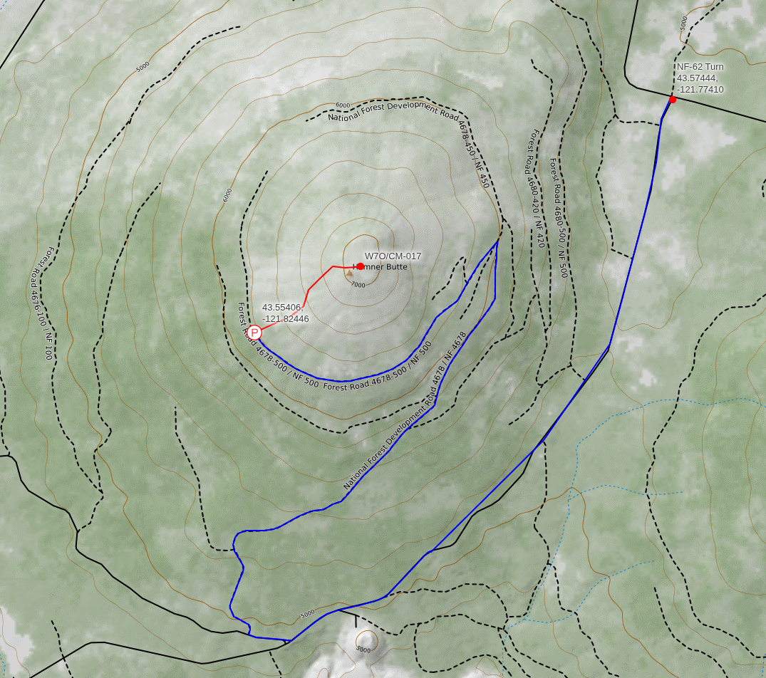 When I activated this peak this is the route that seemed the best to me. There are several ways you could get here based on all of the surrounding roads. The marked route I have on the map is pretty well passable by most SUV/Truck type of vehicles without much issue. There are several ways you could get up here. There is no actual trail to my knowledge. There was a decent amount of brush I had to get through in order to get up there but I was able to find my way fairly easily. There definitely could be a better way that this to get up here from where I parked but it worked for me.