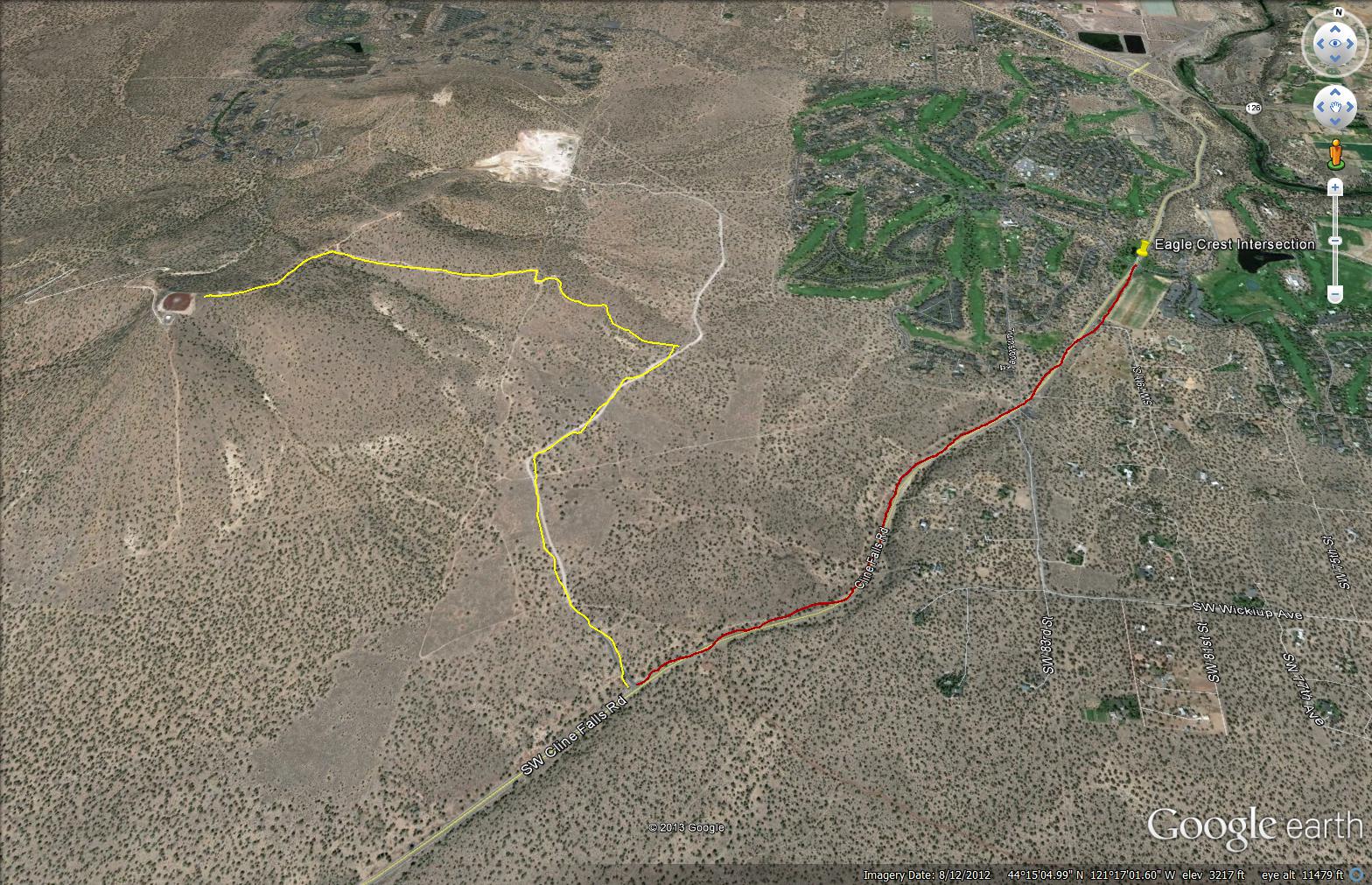 Directions: The map I attached shows a red line going south along Cline Falls Road from Eagle Crest. The distance is 1.5 miles before you come to a BLM sign on the left for the Juniper trailhead. Just past this sign is an obvious road on the right. Take that road one mile up until you come to another BLM sign next to what is a primitive road. Park off the road because gravel trucks use the road from the rock pit at the end. Start hiking up the primitive road. About halfway up you will come to a livestock gate but it is not locked and there are not signs. Almost to the top the main road goes to the right to another radio site. There is a jeep road that takes off to the left which you follow to the top of Cline Butte.