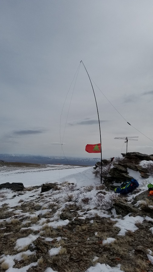 The conditions were horrific. It was cold with high winds. The wind must blow a lot since the snow at the summit was sporatic, a very different landscape than the deep snow on the hike up. I was able to hunker down in the AZ behind a rock outcropping which partially blocked the winds. As I'm finding here in Southcentral Idaho, 2 meters is not productive with no VHF contacts. 20 and 40 meters were golden.