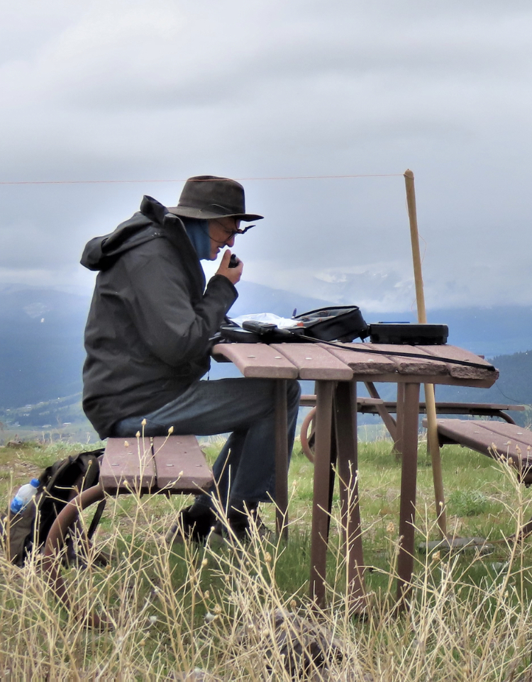 Great views and a few places to strap my extendable fishing pole gave me a good high wire antenna and decent reception. I forgot to bring my bungee straps to tie the fishing pole to the metal stake in the ground so I used two cloth masks I had in my pocket. It worked. Had to think on my feet. I got 10 contacts in half an hour and would have stayed for more but the weather turned on us and it started snowing. I was able to complete this summit for two previous activators, K7MTD and WW7D.