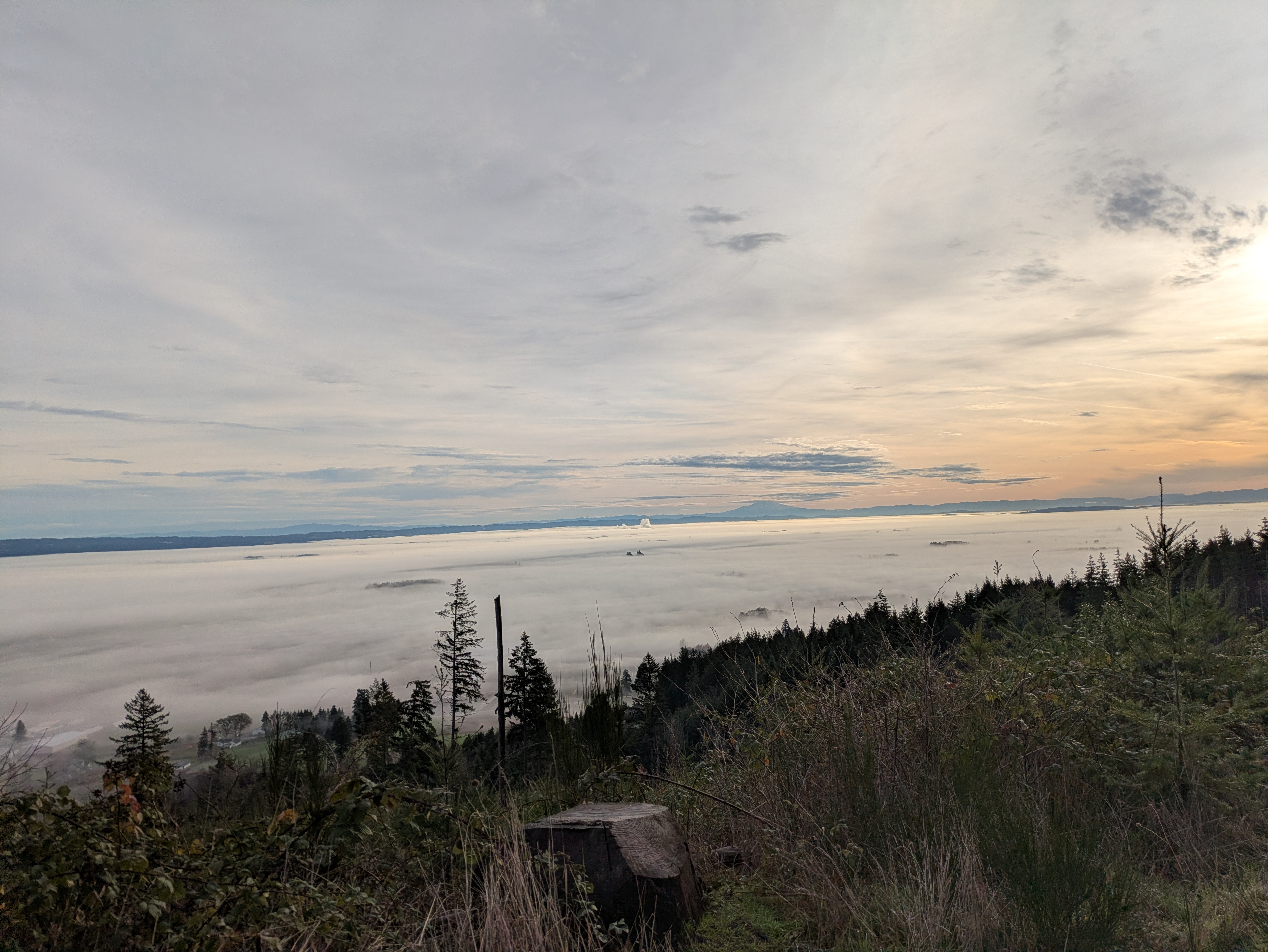 This morning we had an inversion, with clouds blanketing the city below. Out in the distance was Mt. Hood, poking through the clouds.