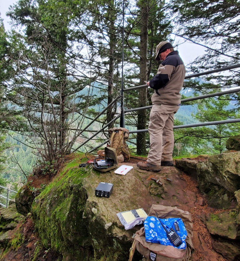 The top was quite windy, but we found a very decent spot just a few steps down from the summit. We used a j-pole on a fiberglass mast and obtained sufficient QSOs within a few minutes. The 20m end-fed had more difficulties finding a good attachment point due to length, and since it was nippy, we moved on to Larch Mountain (W7O/WV-062, Oregon one).