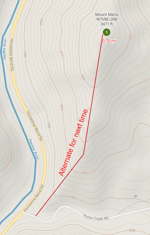Yesterday's SOTA adventure took me to the top of Mount Maria near Horseshoe Bend, Idaho for a first time activation. The hike up was right at 1 mile in length and took about 45 minutes. The last section was very steep, so had to slow down the pace quite a bit.