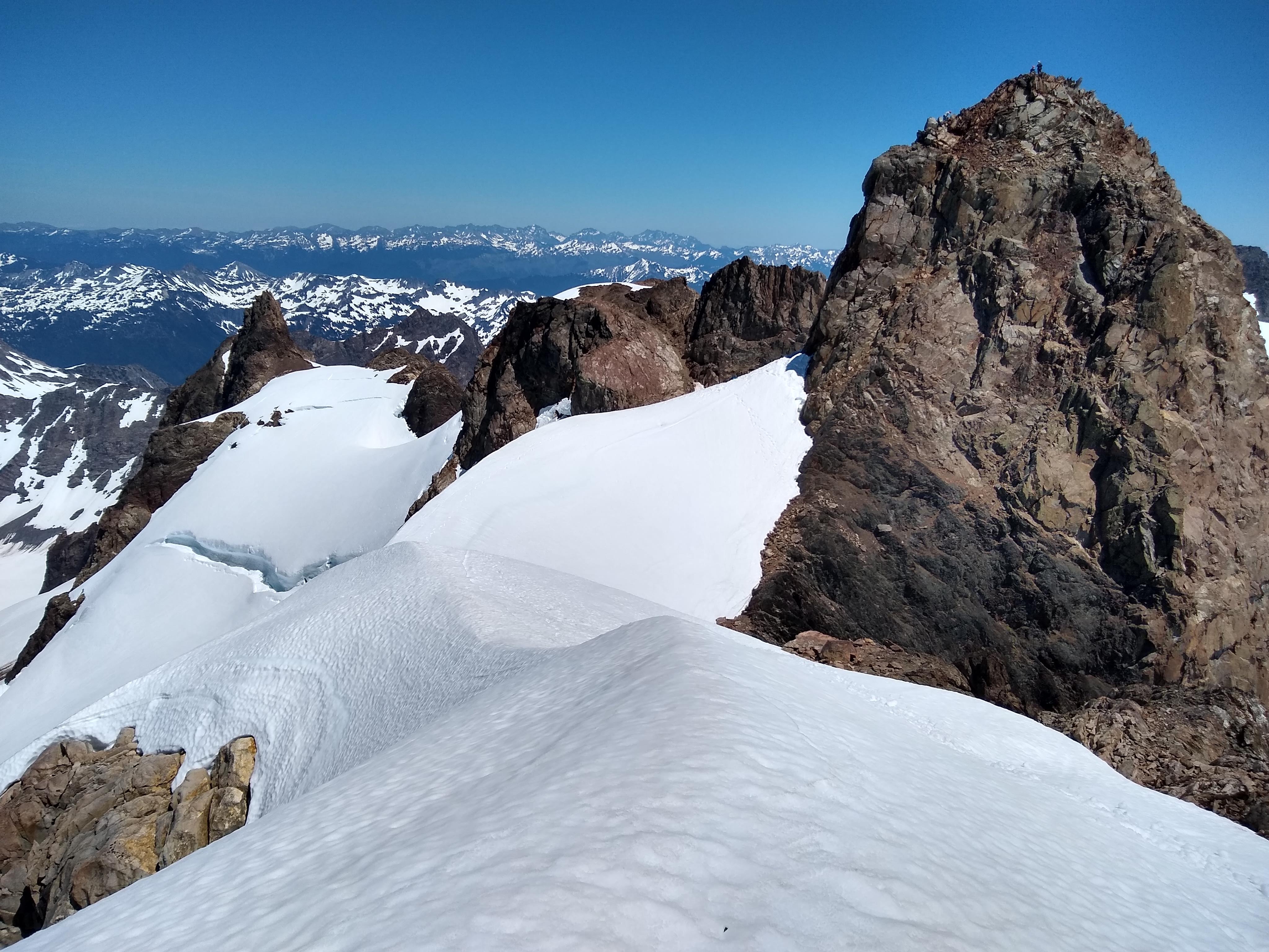 The final snow climb to the true summit looks steep and intimidating. But it has a good run-out, so a slip would leave one sliding down into a fairly safe bowl if unable to self-arrest. After this climb, we assessed the summit block for a route. The most appealing route is the 5.4 climb up the north face. Two climbers had just descended that route, and the group of four ahead of us prepared to climb. We were happy to watch them, and they seemed proficient. Another group of 6 came up behind us and also planned to use the same route. Then another group of four came up. The four also wanted to use the route but couldn't afford to spend the time waiting. Instead, they climbed back down to the saddle to look for the scramble route.