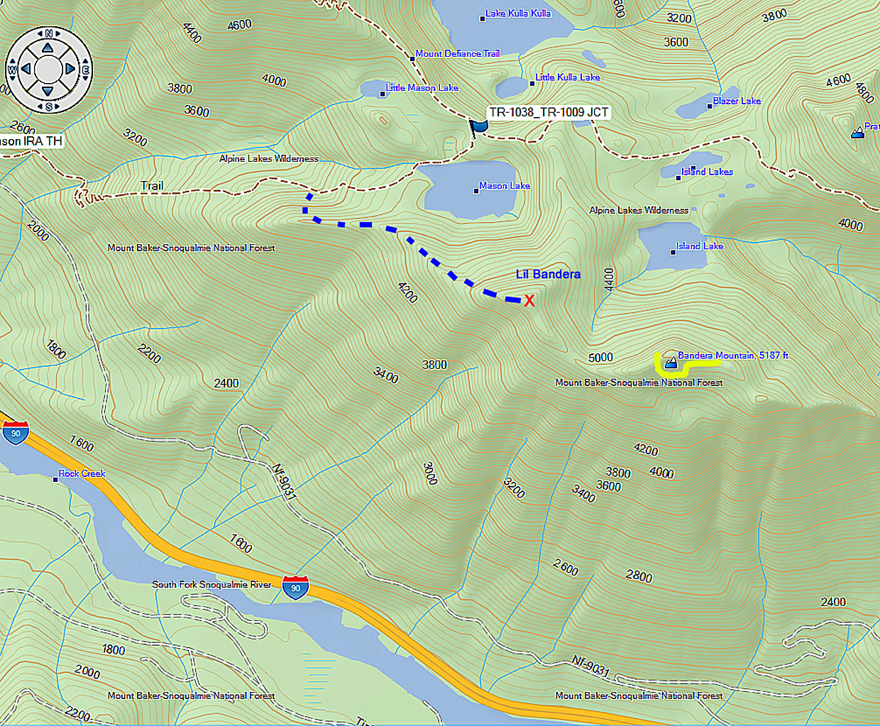 From the intersection the Bandera trail is an unmaintained boot track that ascends almost straight up most of the way to the View Point, called Lil Bandera on my Green Trails map.  My GPS said the elevation here is 5140.  This spot is very scenic and the warm sun on a cool day was inviting.  I wanted to operate my radio from this point.  I knew I was approx 60 ft from the true summit but I couldn’t remember how low the activation zone was.  So it was decided to press on the remaining .8 mile to the true summit.