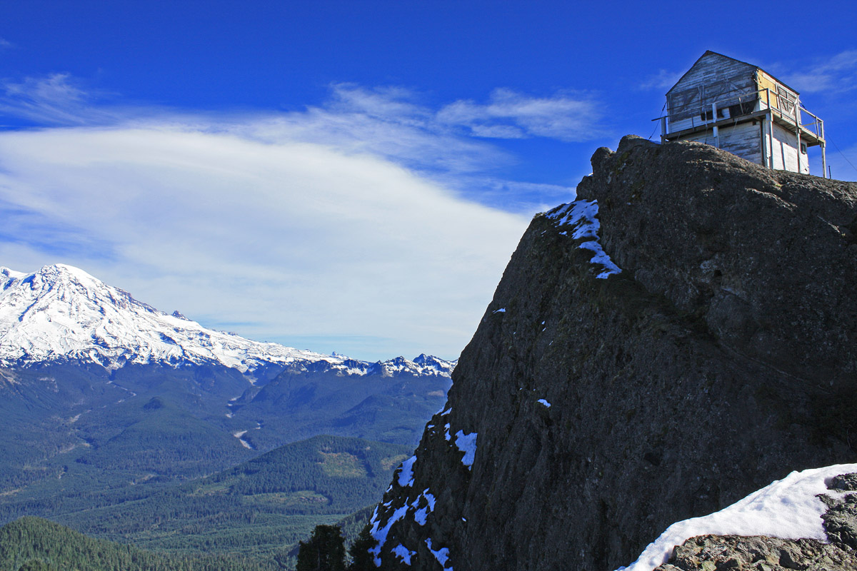 The hike is on a beaten path up a ridge back which ends on a large rock face.  A few hundred feet up the rock is the lookout cabin perched on the very end with a sharp drop off.  The cabin had its shutters down but the door was open for touring.  All of the usual lookout equipment was missing.