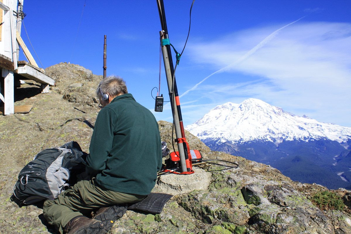 Pat WT7N and I had been to High Rock before but in the rainy fog with 30 ft visibility.  For this days hike it was clear with superb views of Mt Rainier looking north.  Mt St Helens, Mt Adams, and Mt Hood are to the south.  Nearby is the Tatoosh range with 4 SOTA summits and further to the east is Goat Rocks with SOTA's Ives Pk.