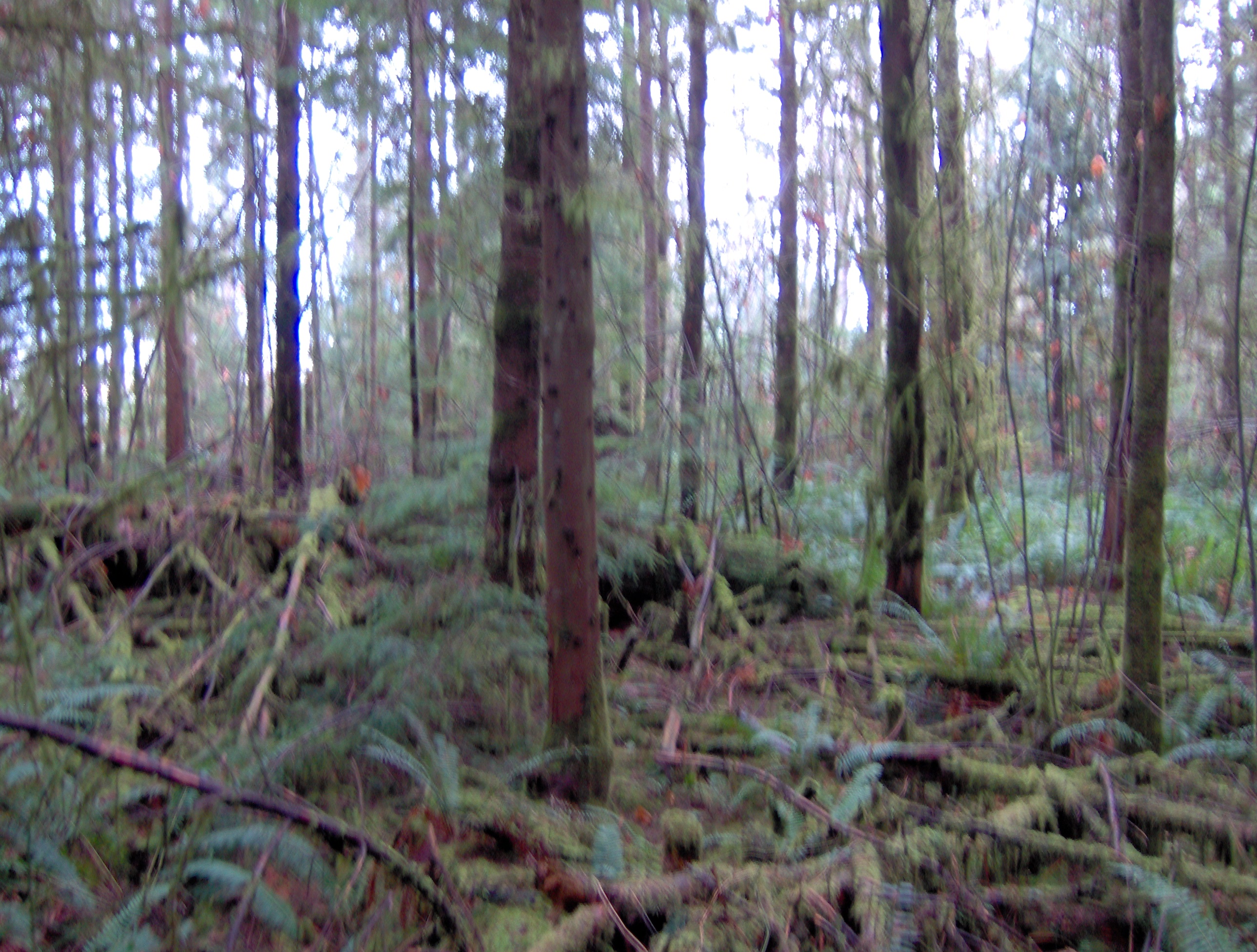 I started out on 40m this time, and was happy to have K7TQ in Idaho come back to a CQ. After a few more CQ's I got NS7P in Oregon. I gave it a few more before moving on to 20m, which was much more fruitful. K6ILM was first on the scene, and the usual suspects followed, with a surprise or two. The principal one being JA4FKX/QRP, who had a FB 579 signal. (and gave me a 559). Contrast this with the 229/339 reports I was getting from southern CA and the mid-west. I'm beginning to think the vertical EFHW is a better DX antenna than one for domestic QSO's. I have 2-band inverted Vee in the works, I'll probably use it next time. The last Q in the log was the loudest (as usual): Ku6J, who always pins my ears back with his signal. What does he have for an antenna? With no more answers to my CQ's and starting to feel the cold, I packed up the station and ate my lunch. I decided to try to find the real summit with my GPS, and after a bit of tramping made my way to it. I'm not really sure it was much higher than any other spot within 200 feet, but FWIW, I took a picture. I did have cell coverage there though, 2 or 3 bars worth. But it was pretty thick with sword ferns and downed branches.