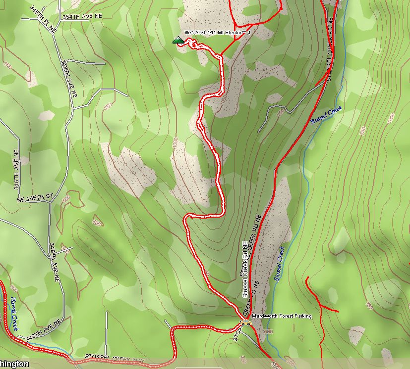 With a couple days of non-rain, I just had to get out of the house and activate a summit. "Mt. Electric" is the first summit I've activated that wasn't a "first activation". That said, it was about right for me at this time of year. The drive is an easy one. I won't go into details - but all except the last mile is on paved roads. I've trooped around a bit in the Marckworth State Forest before, but not in this part. Parking is at a 4-way road junction (but 2 of the roads are gated.) I headed 1.5 miles up the gated road to the north, a wide gravel road in better condition than the one I drove in on. It's a moderate climb for the first 1/2 mile or so, on the west side of the slope, then heads to the east side of the ridge and levels off a bit, until you reach the high point in the road. I could probably have stopped there and set up my station, as the elevation was ~1040 ft per my topo map (& GPS), but I wanted to see if I could get to the summit, at 1090 feet, if only to be in cell-phone range again. I headed into the woods, mostly ~50 foot evergreens, with pretty easy going, except for a patch of salmonberries at the start. I made it to within ~250 ft (horizontally) of the summit before finding a nice open spot under some trees, and deciding it was close enough. The summit is very broad and ill defined, and all completely forested.