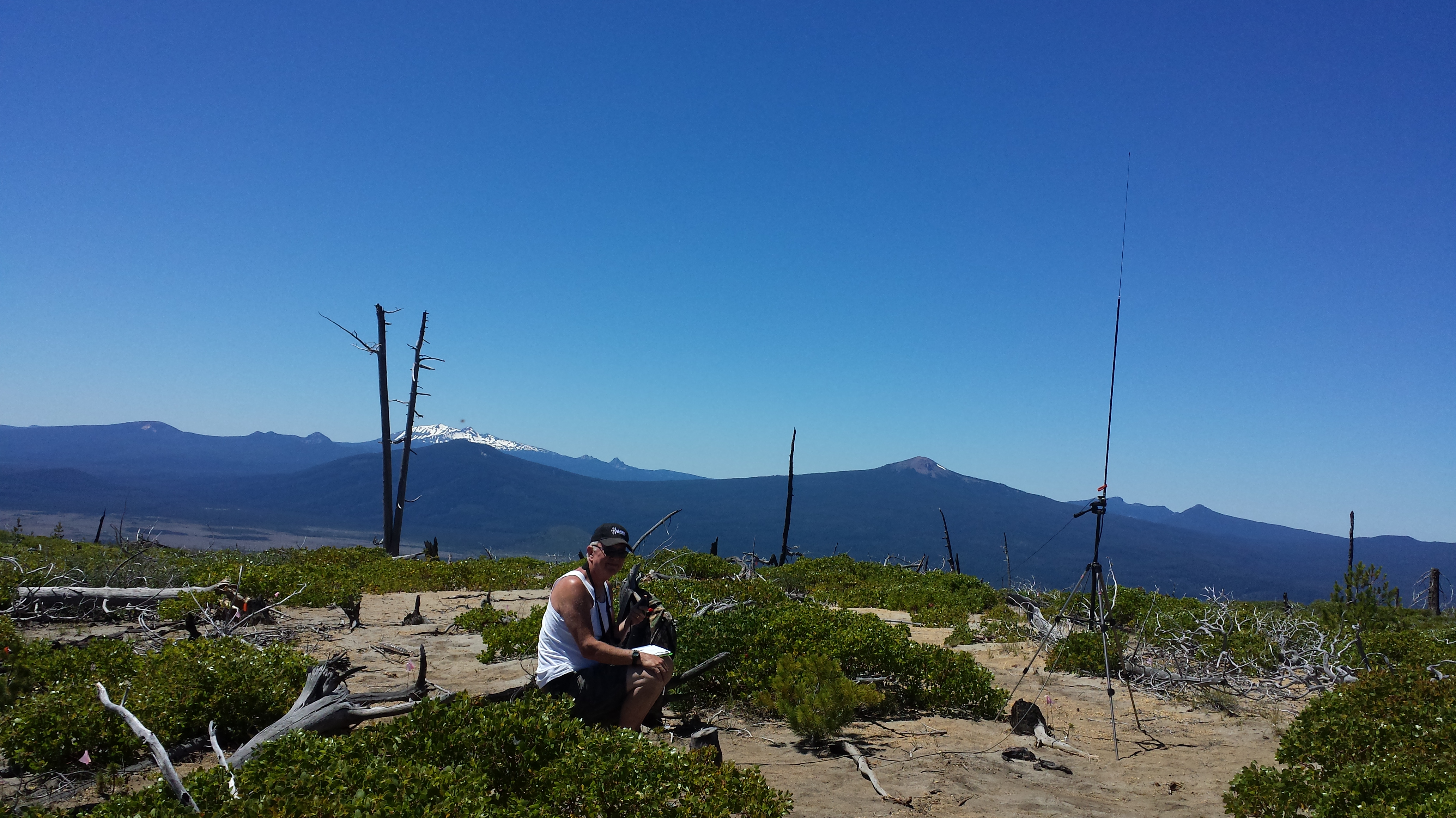 Davis Mountain is a drive up summit if you have four wheel drive. Passed Oakridge on hiway 58 turn left on the Crescent Cutoff then go and turn left again to get on the Cascade Lakes Scenic Byway. Near the Davis Lake campground turn right on to National Forest Road 62. Then proceed on Davis Mt Lookout Road to the summit. The road gets very narrow and technical at times. I made it in my Jeep Wrangler and think you should stick to a 4x4. At the summit, there is a large activation area. Getting the required pre-summit yardage in is easy as ther is lots of places to check out and super views to see. No shade at the top and very little antenna support. I had zero cell coverage with AT&T. I had a hard time getting myself spotted on Sotawatch till W0MNA heard my puny three watts, and spotted me. Even made a summit to summit with a So Cal SOTA station. Lots of fun though and the bugs weren't too bad. It was an easy 6-pointer. Thanks to all the super chasers..