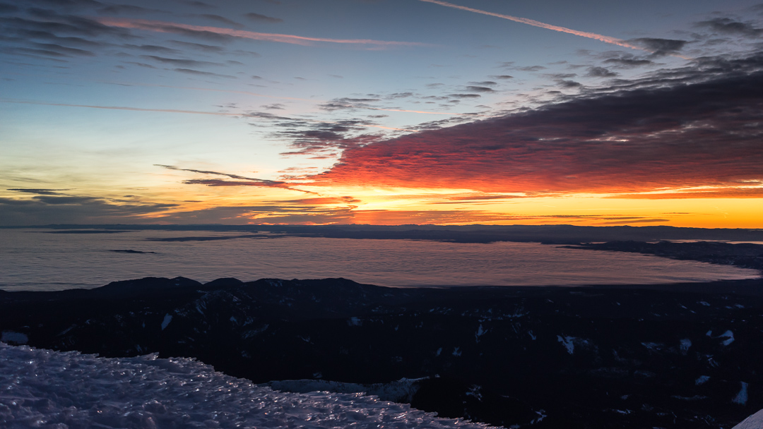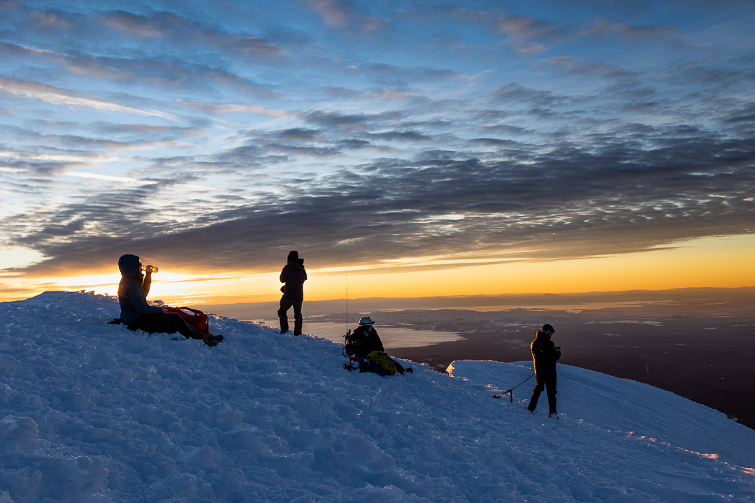 My friends and I left the climbers lot at Timberline just before 2am. We took our time and made the top of Palmer around 3:40am. After a quick breakfast we continued up the mountain on good solid snow. We were hit with sulfur from Devils Kitchen throughout the hike up.