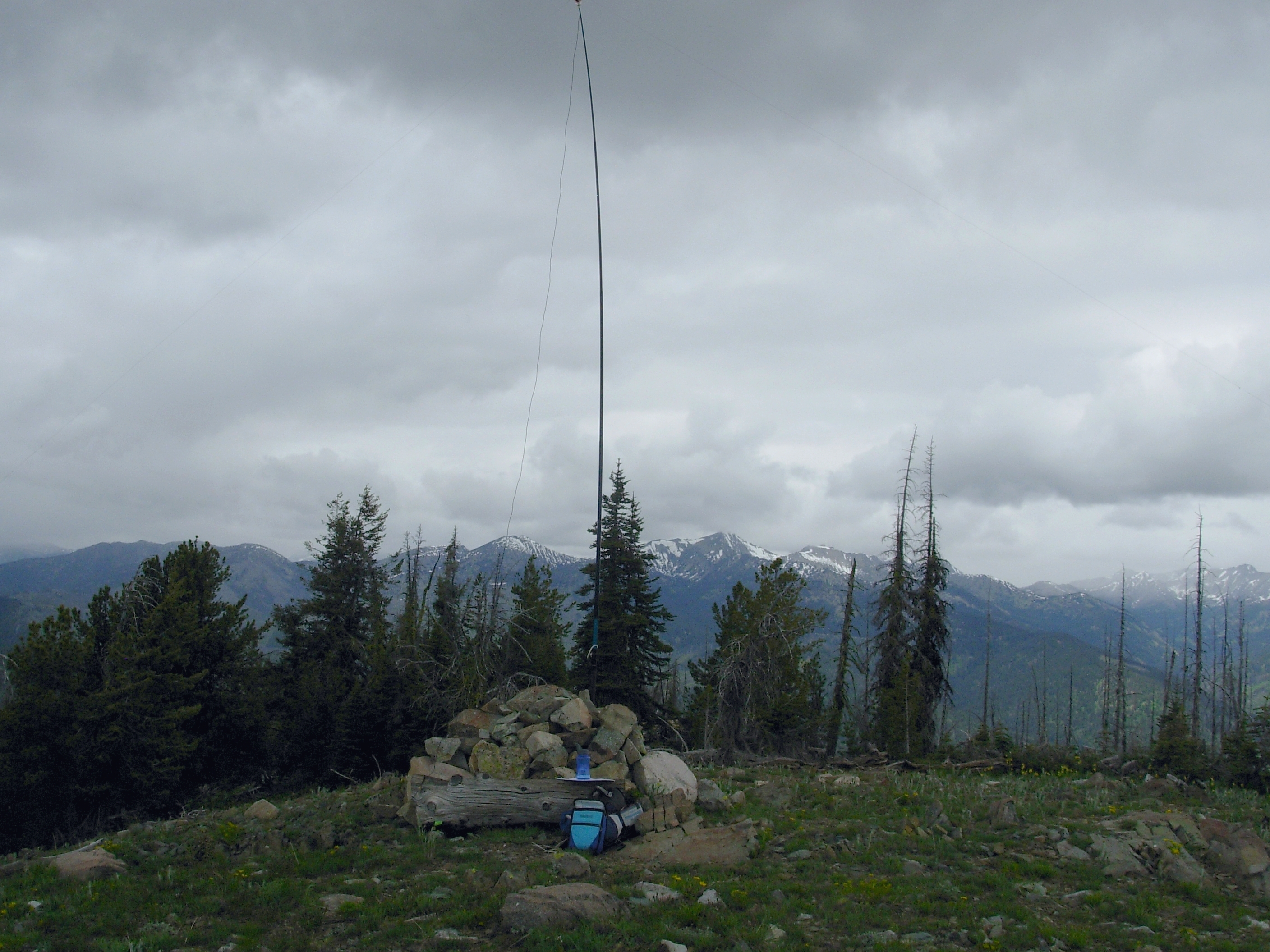 The summit is large, with plenty of room for a dipole. The cairn was a perfect support for my telescoping pole. The day was cloudy with sunbreaks. If it had been colder, it would have been simple to move down the gentle slope to get out of the wind. It didn't rain, but a very light snow reminded me that this peak is over 6500 feet. I was warm from the climb, and the temperature was about 50F so I just sat next to the rocks and enjoyed the view.