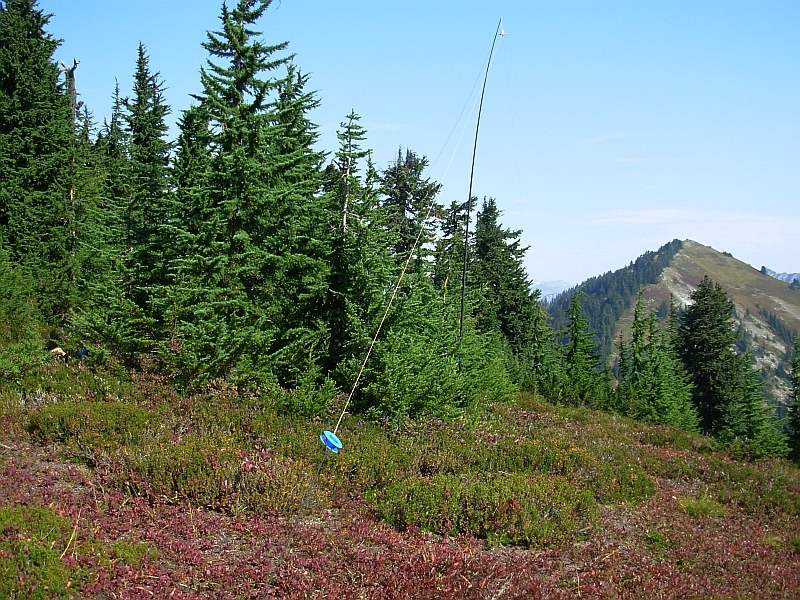 The top of Union Peak is sparingly forested with plenty of antenna room for my linked dipole. I tied the telescoping pole to a small tree and didn’t need guy lines. Found a shady spot and operated in comfort for about 40 minutes making eight 40M contacts and 17 more on 20M. Even with my slow approach, I was only 20-minutes later than my activation alert posting and was able to continue towards Jove Peak right on schedule.