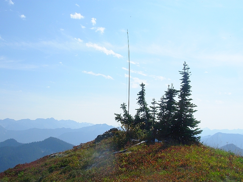 Jove Peak s an exceptional viewpoint with very few trees to obstruct. The top is long and fairly level in one direction. There is a lot of low vegetation grows in the shallow topsoil. The huckleberry bushes upholster one whole slope of the mountain with their wiry branches and deep red leaves this time of year. They probably accounted for the one visitor I saw all day – a lone bear who was about 500 yards downhill from me as I reached the top.