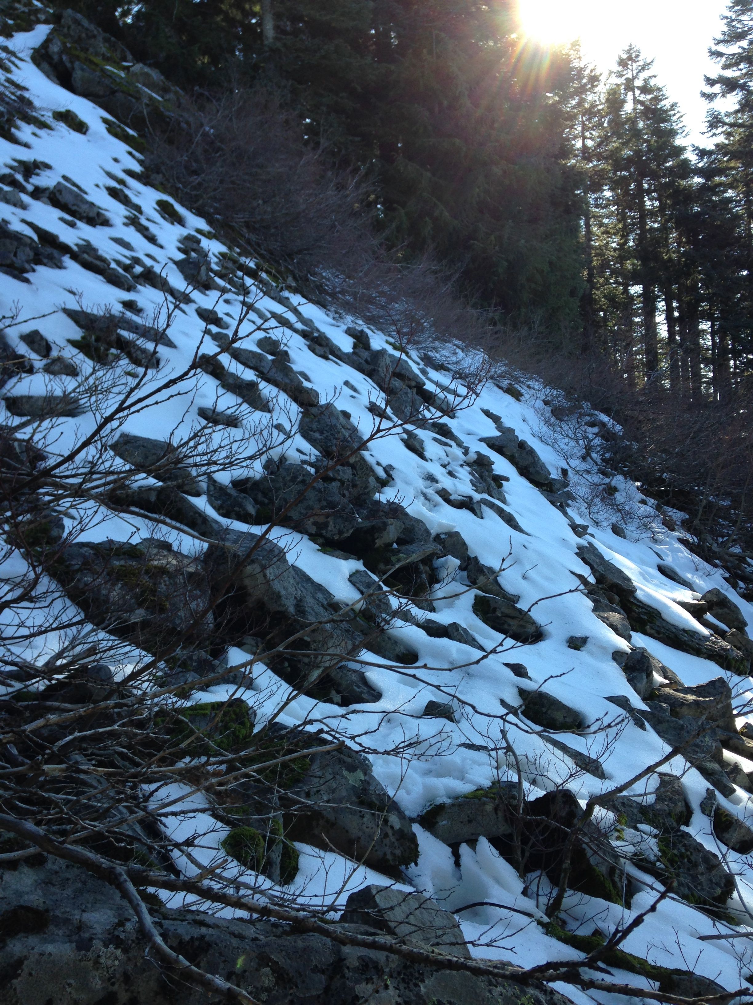 Navigate directly up the spine of the ridge in very thick hemlock and
