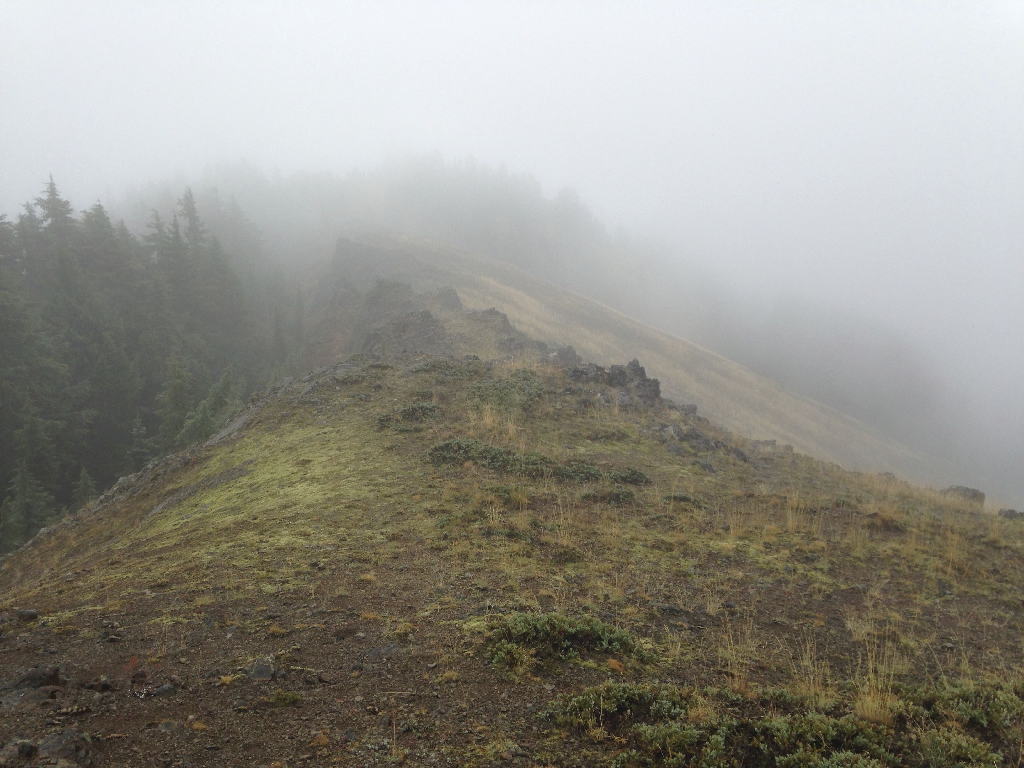 There are several small peak-lets along the ridge. Traverse to the left of the first one. The rest may be climbed or skirted depending on your level of comfort. I suspect the vistas from the ridge are pretty great, but on this day, the visibility was very poor, often less than a hundred yards.