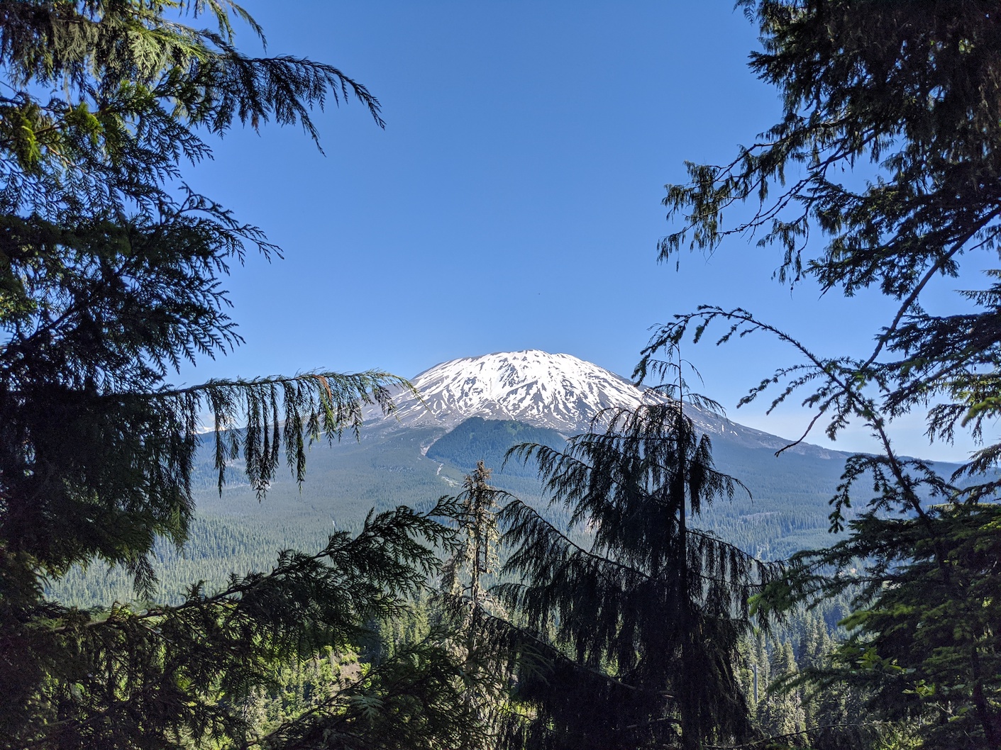 From the clearing, it is just over 1 mile to the summit, with 690 feet of elevation gain. I got to the top in just under 30 minutes. There are just a couple of places along the way where you get a nice view of Mt. St. Helens, but for the most part this whole area is heavily forested.