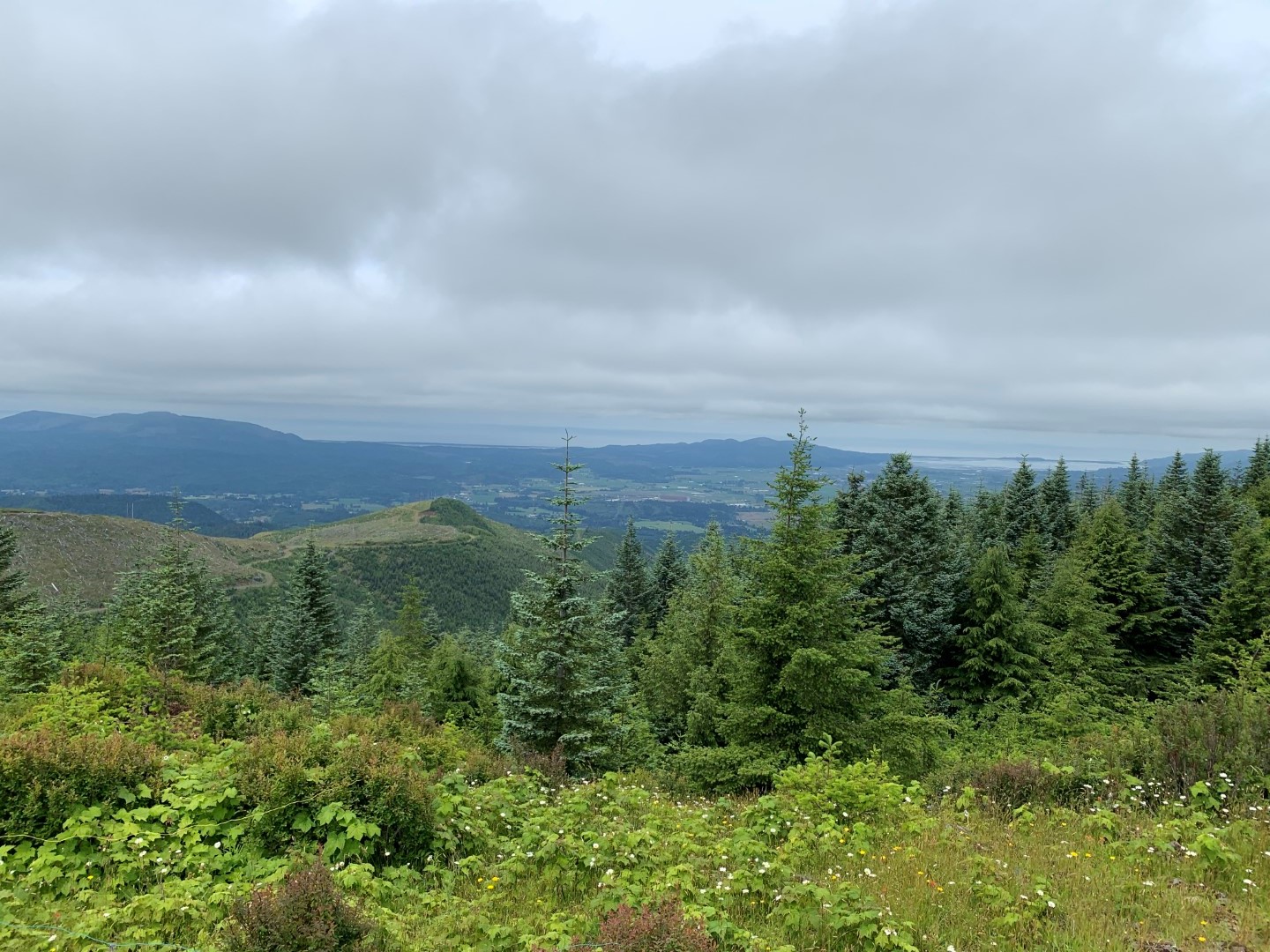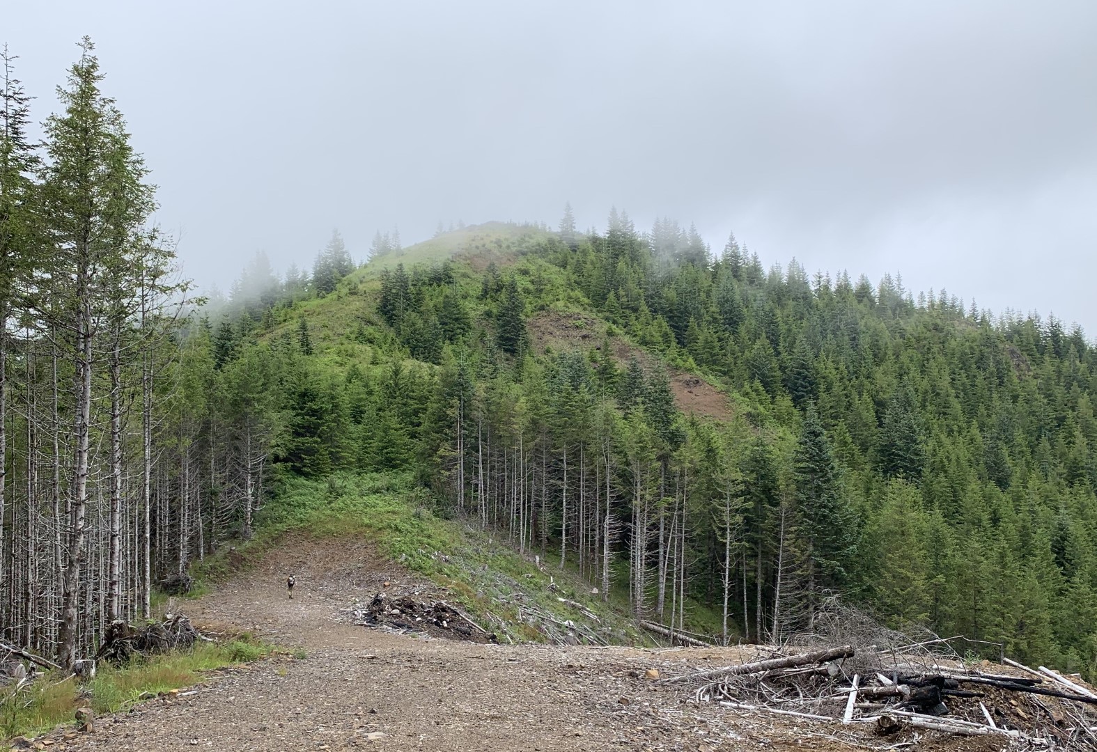 The hike to the summit is about a mile of Stimson access road walking, a very clear path with good views into the valley to the West. The parking spot is visible almost the entire time but your vehicle begins to look very small very quickly. After the stretch of road the route arrives at the base of the final ascent, a somewhat steep bushwhack through some mixed density forest and wild fields for about a quarter mile. We found something resembling a path some of the time, but you might feel you are forging your own through some of the climb. Once the forest thins out near the top, keep to the right/West side to skirt around the first false summit area which has a number of small but dense trees and bushes. Finally the bushes give way to a fairly open summit area. All of this area is well within the AZ and gives plenty of open room to setup antennas. Although invisible though most of the hike along the west side of the ridge, once you get to the summit the view to the east opens up and you can see all the way across the city of Tillamook and into the bay and ocean.