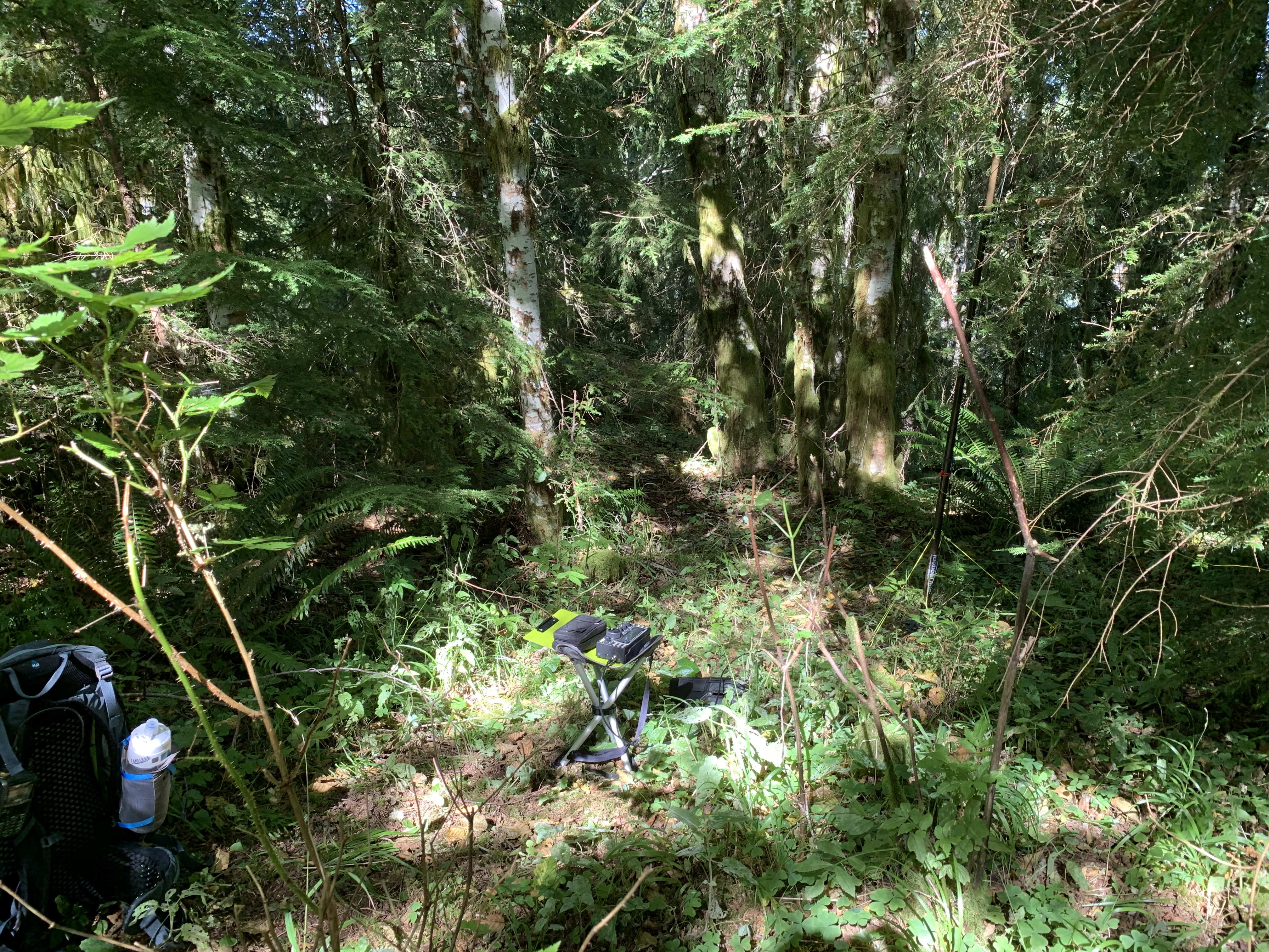 The road terminates within the AZ in a wide open area, although to get to the summit proper requires another short bushwhack up through the forest. The images below show both the open with a fantastic view of Tillamook and the ocrean, and alternately the true summit which has nothing of note to see. Unless you want to operate in shade with the bugs, consider setting up in the bald and enjoying the view while activating.