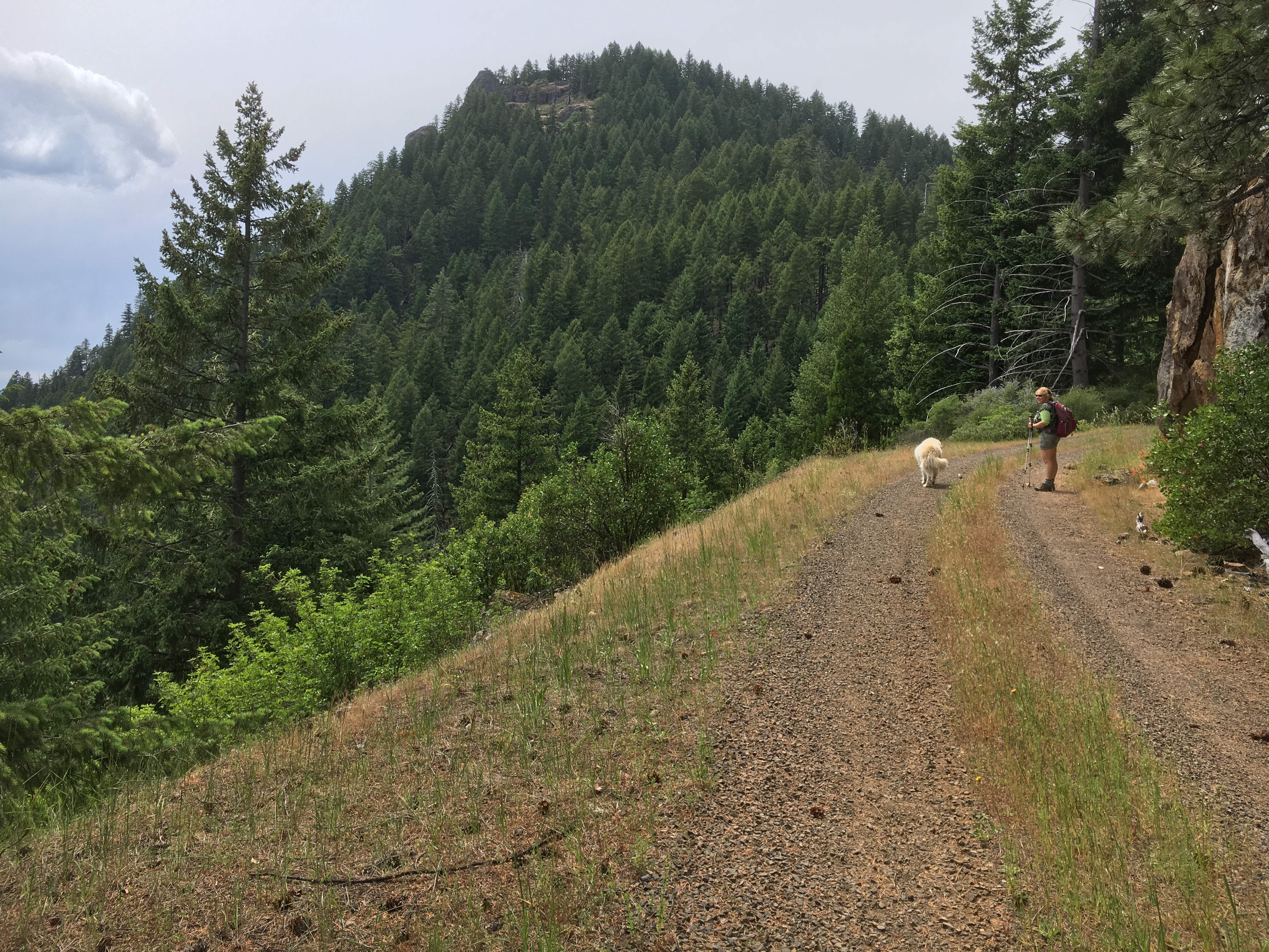 To get to Acker Rock, we backtracked from Pickett Butte to the Pickett Butte turn off bridge. We went back across the bridge and turned right onto the road we had been following from Tiller. We essentially followed the Google Maps directions, finally reaching a left turn uphill with a closed gate. Signs pointed to the Acker lookout. The trail head for the lookout trail is about one mile past the gate in a level clearing. The ascent was somewhat strenuous. The trail was easy to follow. The first mile was on a logging road. After that the trail itself headed into the woods and rose quickly to the summit/lookout. The total from the gate to the summit was about 1.4 miles with a 1400’ elevation gain. The woodland trail was in good shape and easy to follow.