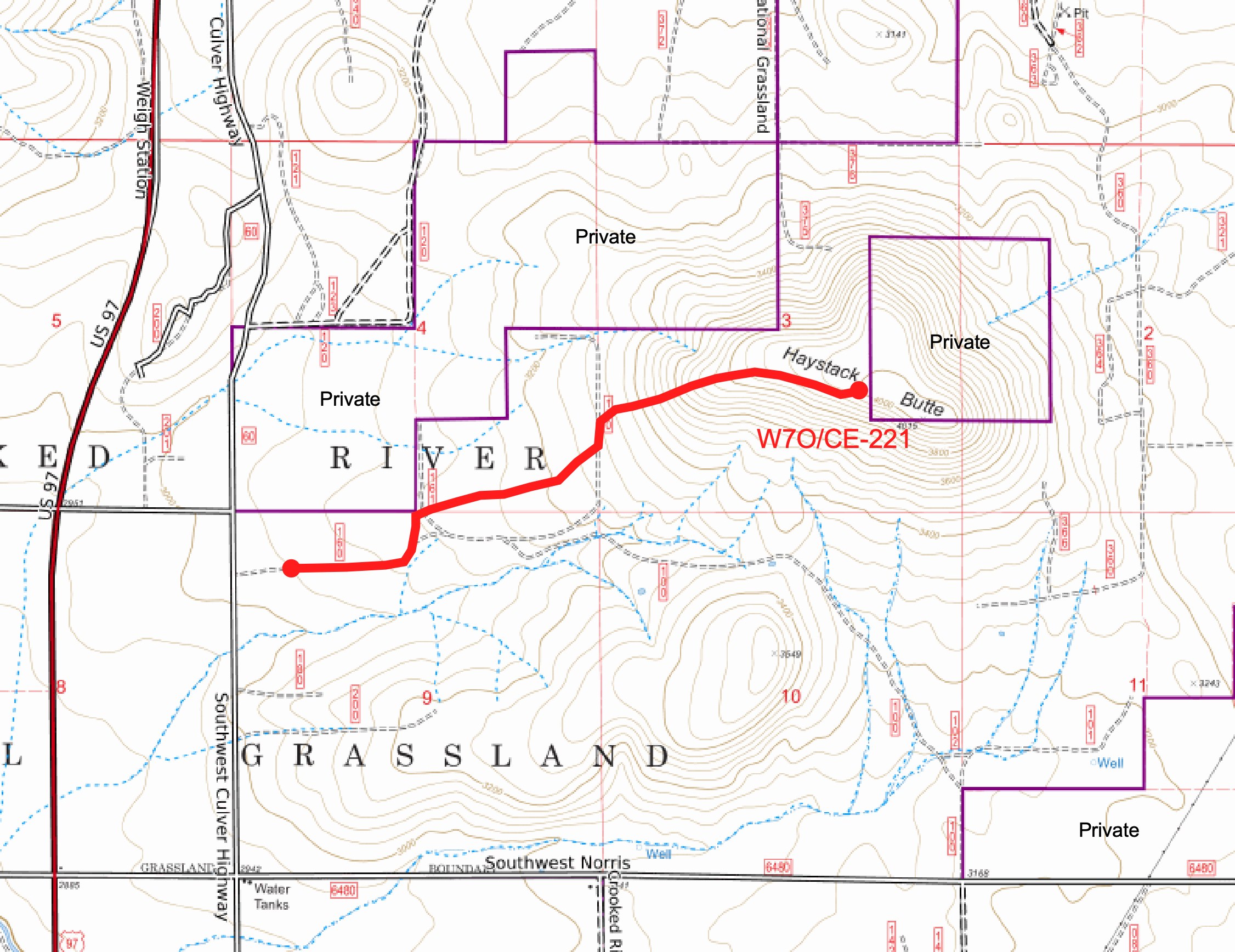 Haystack Butte (W7O/CE-221) is located in the Crooked River National Grassland, which is part of the Ochoco NF.  There are some private grazing lands around the base and at the very top that you'll need to avoid, but access to a large activation zone is available via public lands.  Note that some online mapping platforms such as CalTopo do not accurately show the public/private land pattern in this area.