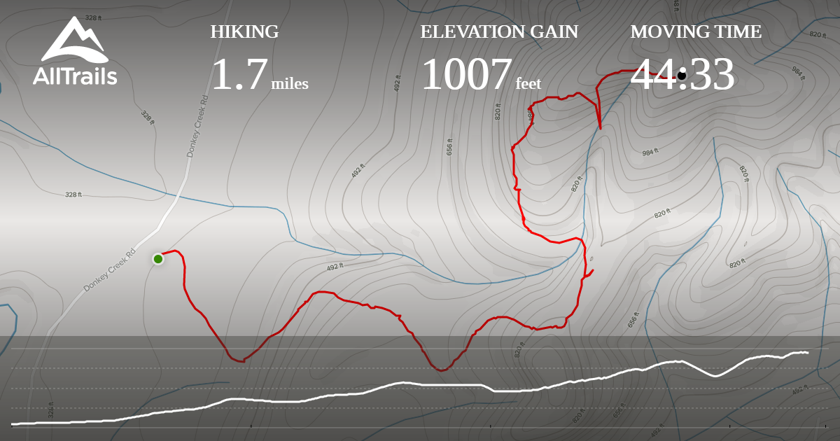 I walked up a path charted on the disused network of logging roads; they are not marked as trails. [See AllTrails map that I made from the satellite view.] The hike was tough due to the incline and the fact most of it is exposed (and perhaps my own level of fitness).  See the recording, below. I went astray at one point and my phone lost track of its position near the top, where it looks like I fell off a cliff. But the chart I built on AllTrails turned out to work out perfectly.