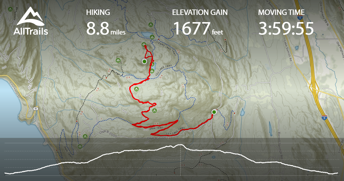 More detail on my track - 8.8 miles and 1,677 gain which included a short side trip to North Butte lookout area.  I followed the Lily Lake trail, and then at ~1.5 miles took a left onto PNW Trail (there was a sign to turn left toward Samish Overlook).  At ~2.2 miles, I then took a right onto "Max's Shortcut" (there is a sign pointed right to Lily Lake").  At ~3.7 miles, you'll be at Lily Lake. Go straight along the left/west side of the lake on the Lily Lizard Connetor trail.  At ~4.1 miles, turn left onto North Butte trail.  After turning onto the North Butte trail you can start heading SW to S toward the summit between the ~4.1 to ~4.2m mark.  There are probaly other approaches, but this seemed the most straightforward.