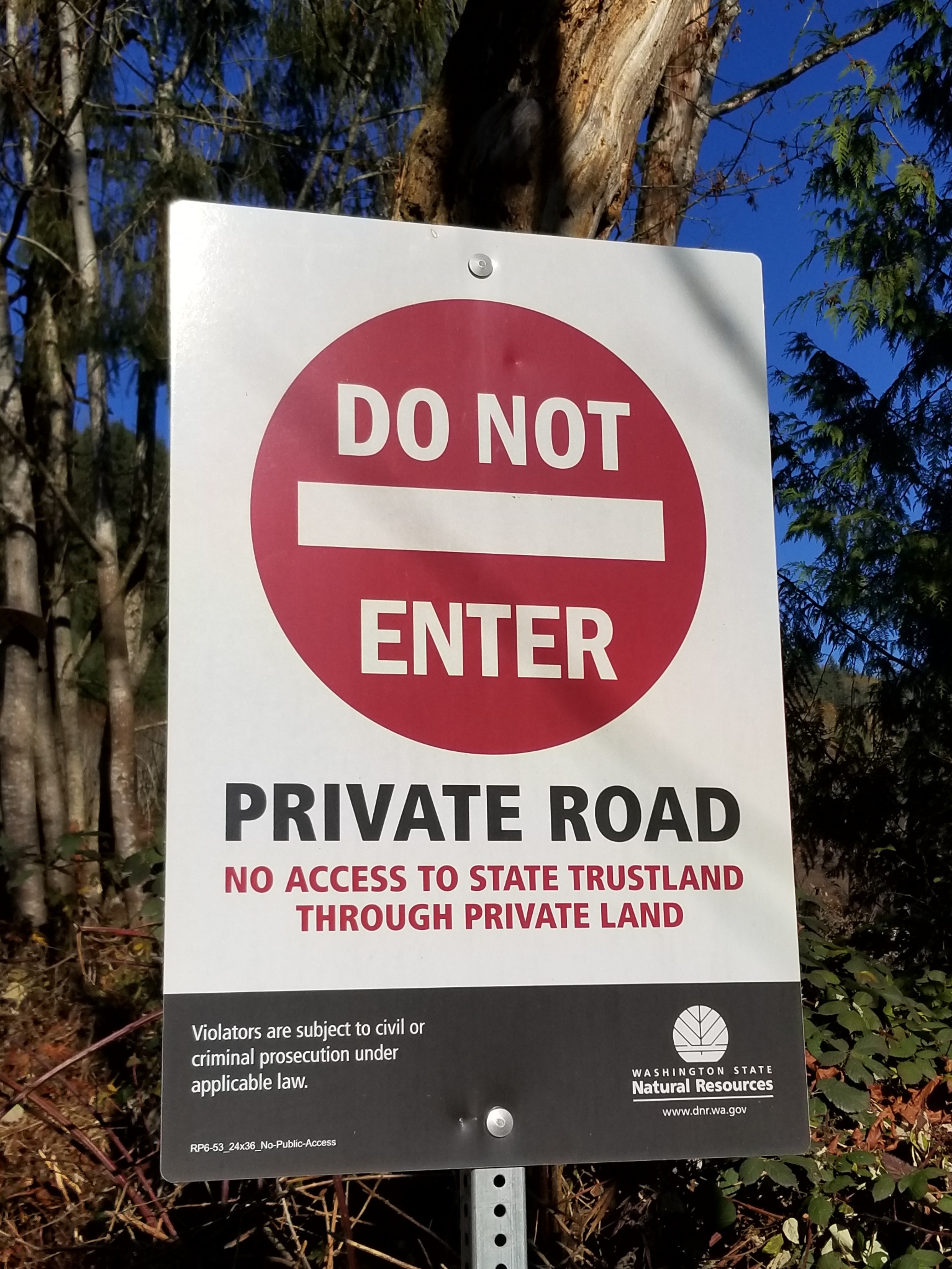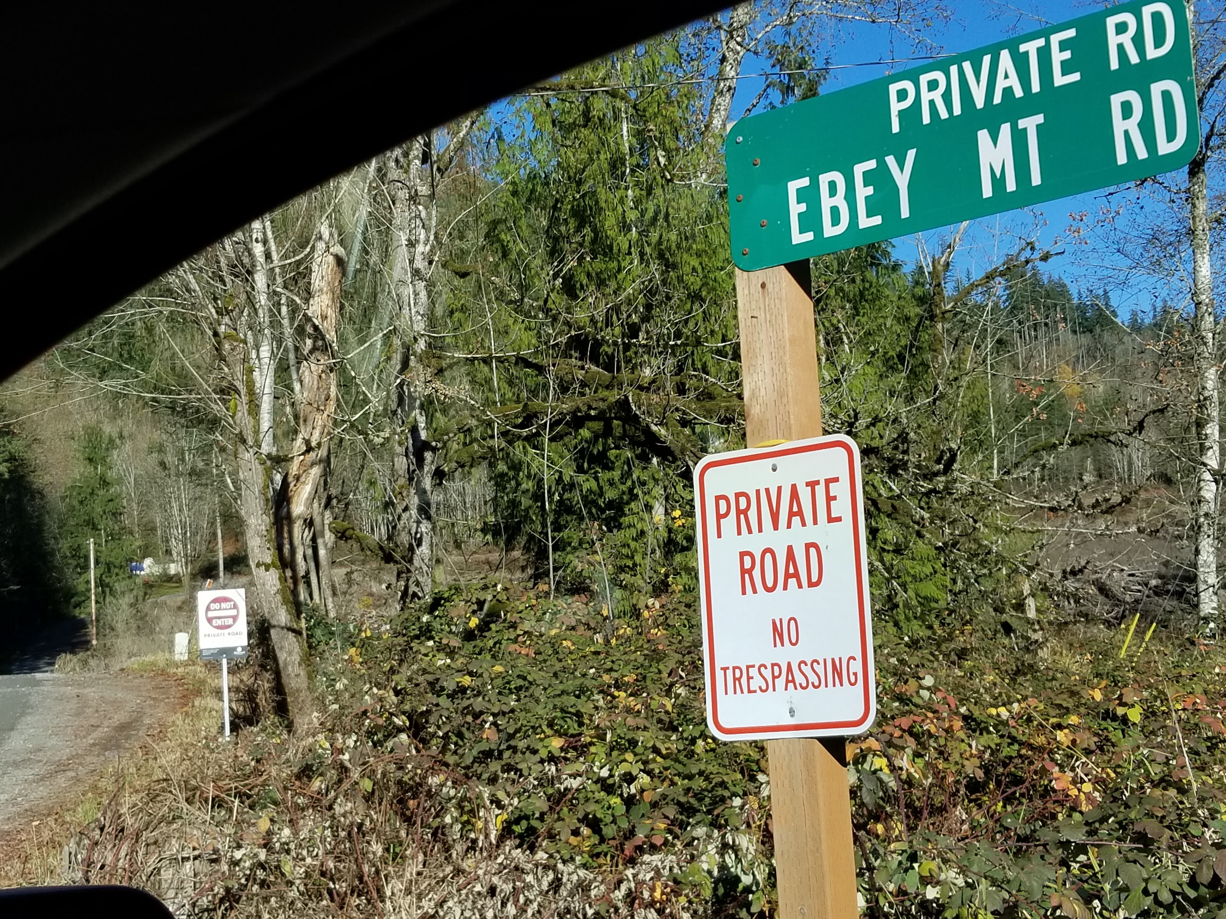 From Highway 530, I turned right onto Jim Creek Rd and was hoping to drive up Ebey Mountain Road. Very clear "Do Not Enter - Private Road" sign posted. Also drove further up Jim Creek Rd, and tried to access from Riley Lake area on East side.
