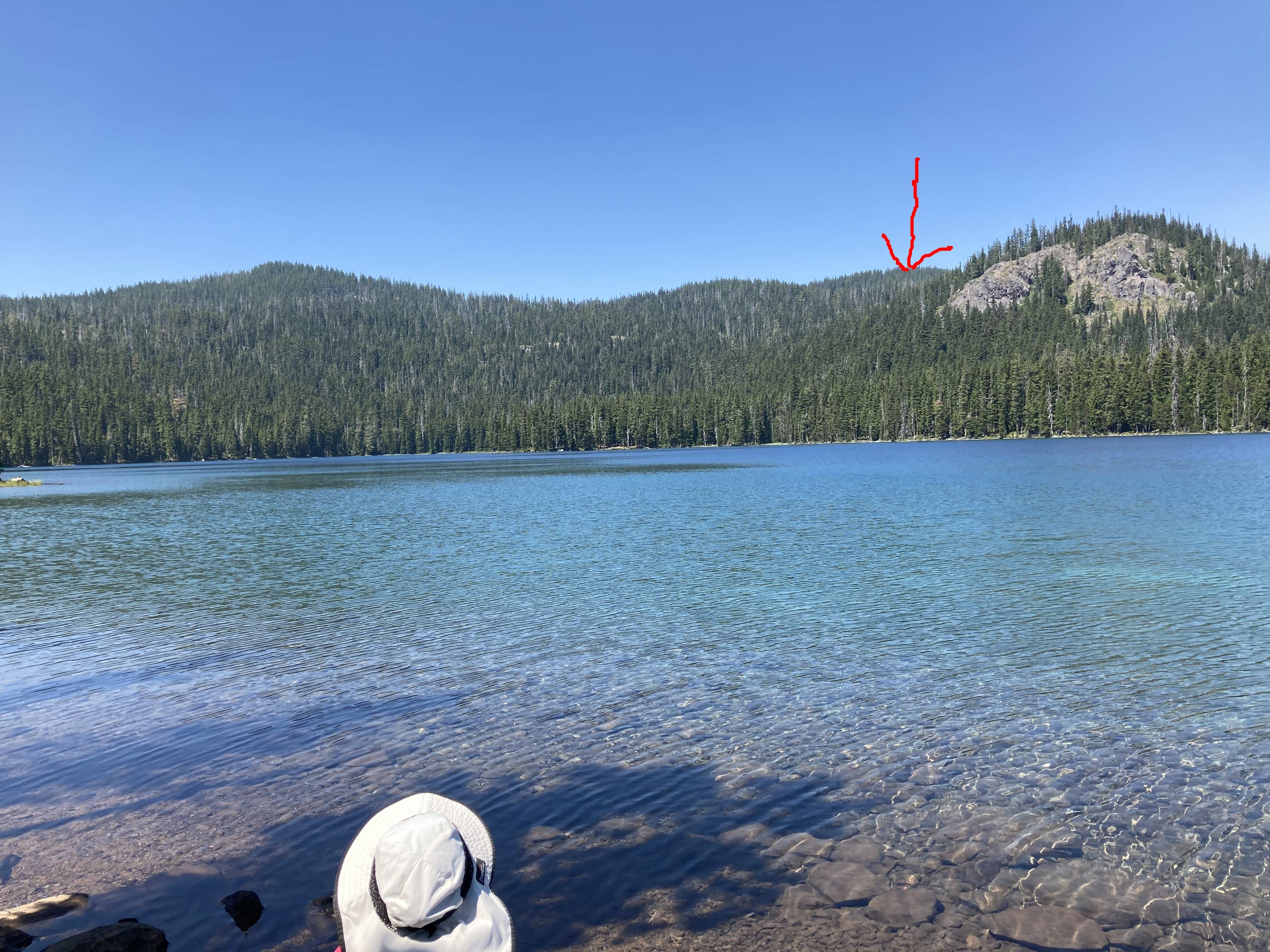 Out of Bend Oregon, on the Cascades Lakes highway, was a yet to be activated peak. Some of my extended family and I were camped at Hosmer Lake. When they decided to hike to Doris Lake, I tried to turn it into a SOTA activation. I had no internet at the camp ground but had listed some of the nearby peaks in advance for just such an opportunity. Given my lack of resources I decided the best way to approach the summit was to hike the trail until it intersected with the ridgeline and walk up that. Given that the topo map I was working from had less detail than I would have liked. This looked pretty good. The ridgeline looked like a long flat thing which would put me in the activation zone before I got to the summit proper. I also thought I would be able to play it by ear a bit when I got there and saw the lay of the land. However, this was an IFR activation. Bring your GPS. The trees are many and visibility is mostly short until you get to the top, which has great views. So my ridgeline walk turned into walking over a couple of other peaks one of which was not far short of the summit elevation. One of the saddles was crowded with fairly large diameter blow down and the other had a beautiful little pond and associated wetlands. Also associated with it was a cloud of hungry mosquitoes. On top it was pretty open, but there were plenty of various size trees to use as antenna supports. Activation went quite quickly as I was able to spot myself with my phone. I didn’t linger at the top as I needed to meet my family at the lake for a swim and ride back to the campsite. Coming down I decided I should drop down a bit and then contour back to the trail so I would not have to regain the other summits on the ridge. This worked well for a while and then the forest got quite young and dense and at times I felt like a full back pushing through a defensive line. At one point I tripped, but did not fall down as there were so many small trees holding me up. There was also one slightly exposed part where I crossed a rock outcropping over a drop off. Footing was good, so not too sketchy. I eventually hit a trail that was near the lake. I don’t know if it goes all the way around the lake, but if it does it would open some other, possibly better, ways to the top. Note that the picture below was taken on the return trip. I did not go to the lake on the way up. If I had I might have just stayed and swam.