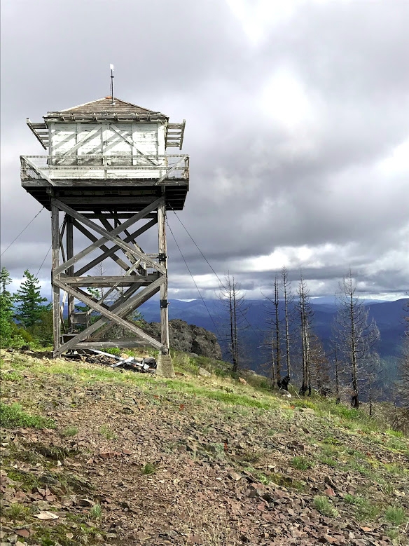 The summit has two lookouts on it and a helipad. There was a volunteer working on the lookouts while we were there so I set up at the end of the short ridge out of his way. There are trees and the lookouts there (assuming no worker bee) to assist with antennas. I put up a vertical and made a few 20M-SSB contacts and a couple of 2M-FM contacts to folks in Eugene.