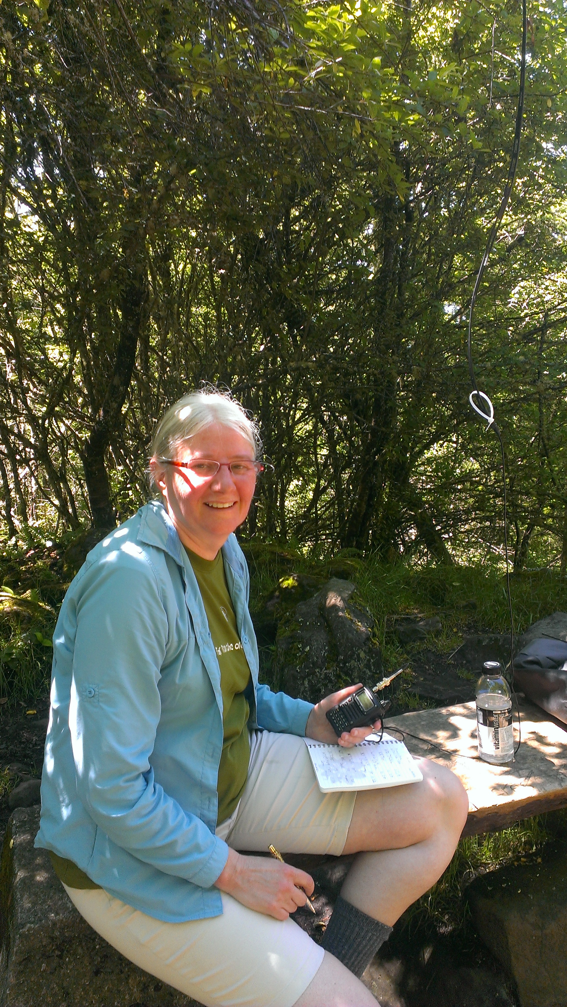 After huffing and puffing my way to the top, I used one of the handy benches to reach up and attach my antenna to a tree branch using a Cable Clamp. Although it was hot out, part of the bench was in the shade. I called CQ and both KD7LXL and KR7W came back right away. I enjoyed a number of conversations, including summit to summit contacts with KR7W and AC7QN, who were on South Tiger Mt (W7W/KG-121).