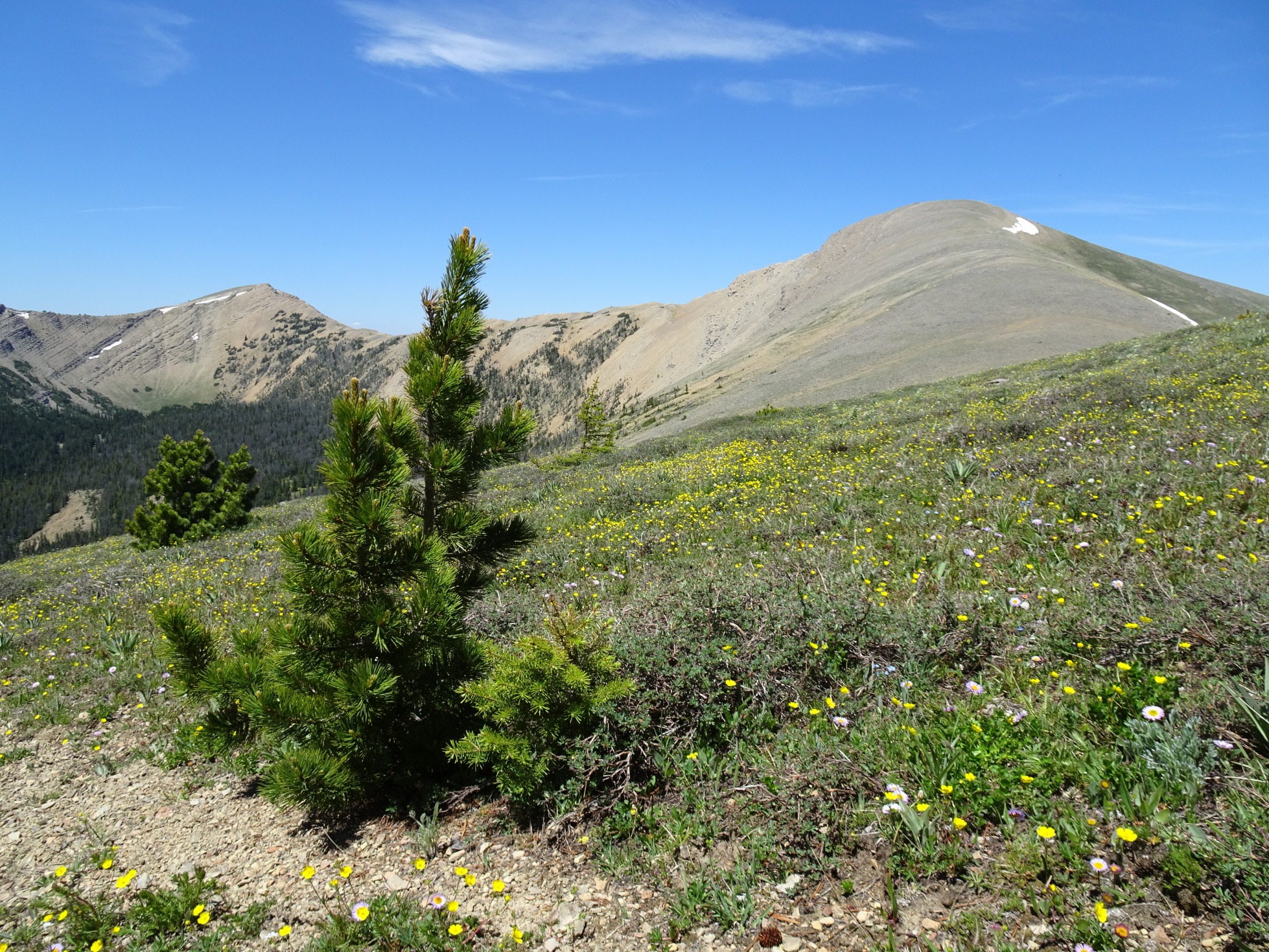 From Bighorn Lake, climb 800 feet back up to the CDT. Follow this trail along the high slopes and ridges out of the Bighorn Lake basin, and down to the small pond that is southeast of Caribou Peak. This portion of the hike is very pretty with fields of flowers and expansive views of the Scapegoat Wilderness. The pond was full of water but may not be later in the summer. It looked likely that water could be found upstream (northwest) of the pond, but I did not investigate. There are lots of good camping possibilities in this area.
