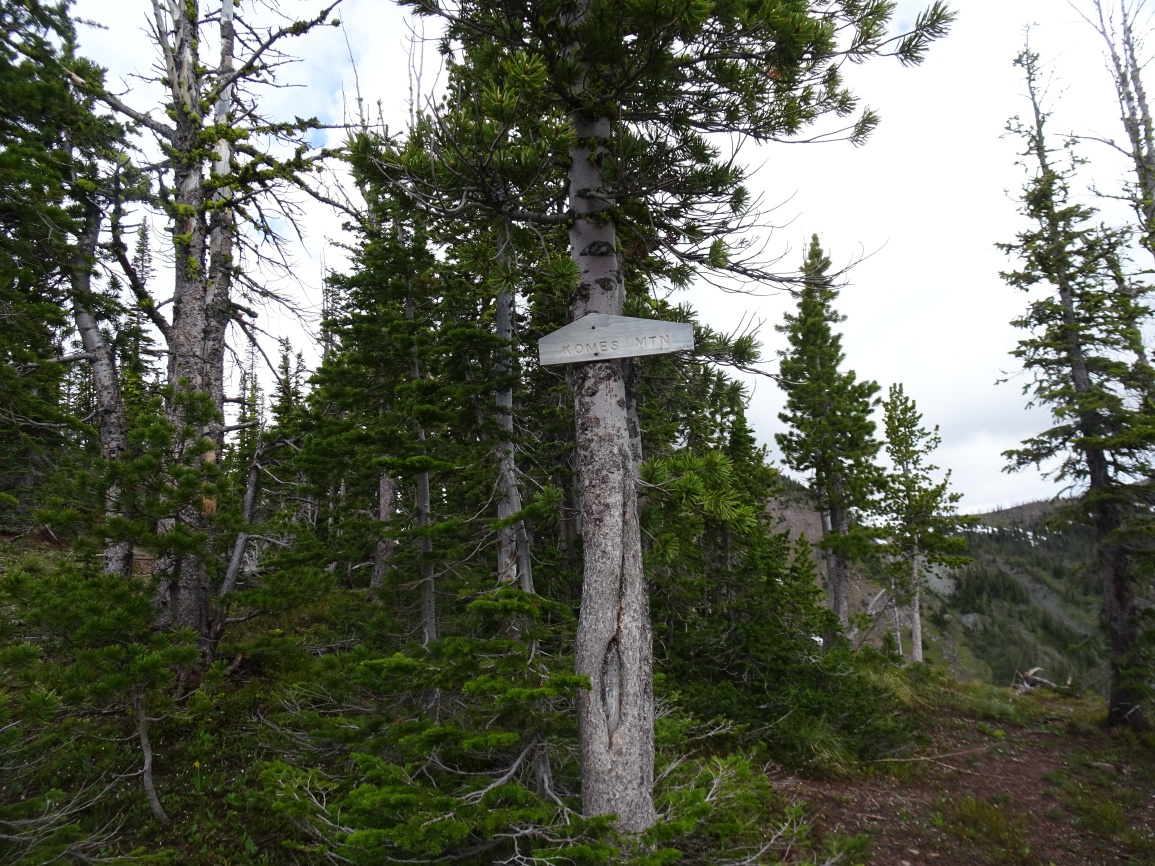 The Evans Peak trail is very well defined and leaves the main North Fork trail about 400-feet before (south) the North Fork ford. The trail has a well-established tread and is not heavily used, but it is periodically cleared by either hunters or the USFS so it does not suffer from excessive amounts of deadfall. Much of the early portions of the hike is in dense regrowth from the 1988 Canyon Creek burn, but the trail soon contours up through steep meadows that provide beautiful views of the Tobacco Valley, Cooney Creek, and the Carmichael area. The trail does not climb over the 7,400-foot ridgetop sub-summit as shown on the 7.5’ quadrangle, but instead takes a kinder route to the south between the 7,400’ contour and the nearby 7,388 ridgetop sub-summit. It is from this saddle that Evans Peak is first visible. Continue following the trail as it contours around the 7,400’ sub-summit to reach the gentle east-west subalpine ridge that leads towards the 8,348 sub-summit on the Evans ridge. There is a non-USFS “Komes Mtn” sign partway up the ascent to pk 8,348 that appears to mark a trail junction – perhaps to the nice-looking bench that lies below to the northwest in the Dobrota Creek basin, or perhaps to the Dobrota – Cabin Creek trail. We continued up towards pk 8,348, but contoured around its south side a bit to reach the Evans ridge. Once on the ridge, you can either go left to Evans Peak or right to W7M/CL-195. The hike along the ridge to the Evans Peak summit is fine & not as steep as it looks – there are no particular difficulties. We saw recent grizzly tracks in the dried mud near the summit.
