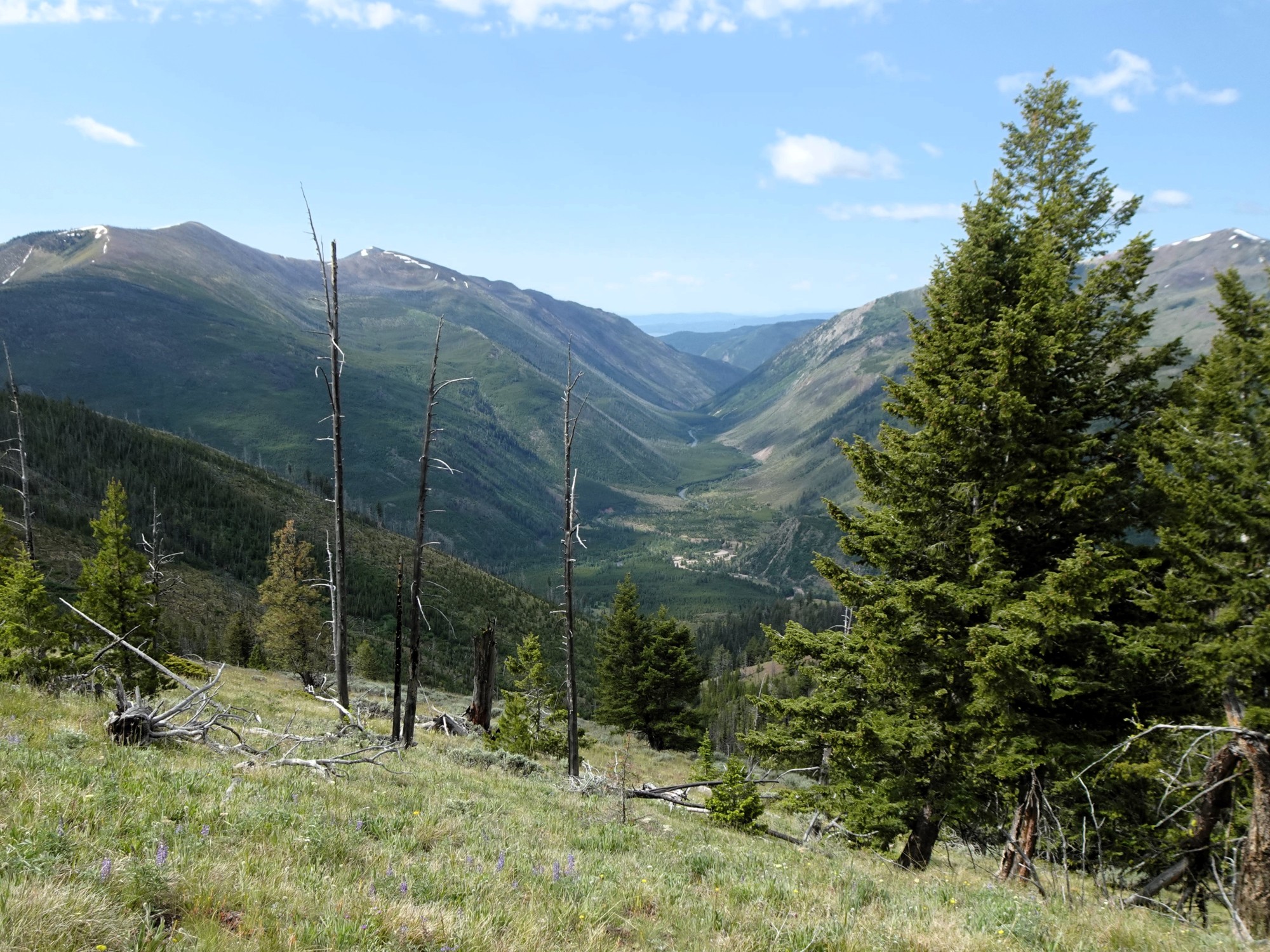 Hike north 6.4 miles on the well-traveled “Hobnail Tom” trail (Tr. 32) to the vicinity of the North Fork Guard Station. This trail is a well-traveled and highly maintained primary access point for the Scapegoat and Bob Marshall Wilderness areas. The trail crosses a packbridge across the North Fork of the Blackfoot River about halfway to the Guard Station, then a second packbridge immediately before the Guard Station. All of the approach hike is within the perimeter of the massive 1988 Canyon Creek Fire. Most of the area between the Trailhead and the 1st packbridge is within the perimeter of the 2017 Rice Ridge Fire.