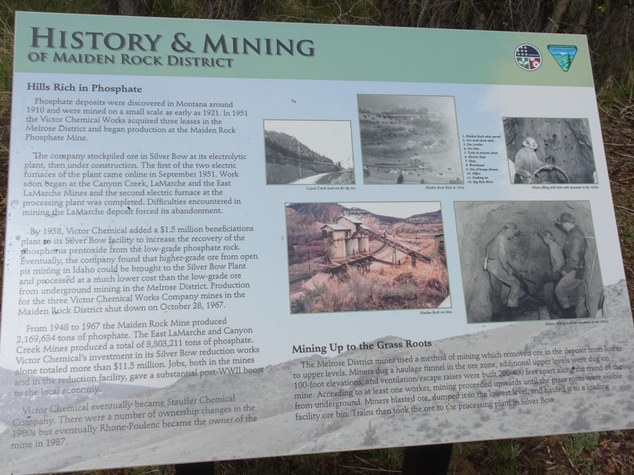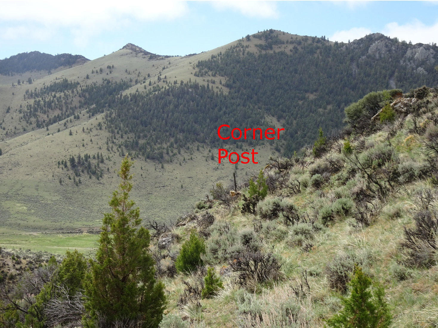 Take the Moose Creek Exit (Exit-99) from I-15.  Follow the Moose Creek road westbound & turn left at the “Maiden Rock” sign & follow this road down to the Maiden Rock Mine Interpretive area just before crossing the river.  Park here & walk NE up the hill, through the gate in the barbed wire fence.  Angle upwards & to the right – with the objective of getting onto the right side of the north-trending ridge.  The ridge crest (and areas to the left) are private property.  The private property corner is on the side-hill & marked with an old wooden post.  After rounding the post, head towards the right side of the summit.  It is easier to stay on public land after this – so long as you resist the temptation to head straight up the fall-line.  After you cross the first gully/swale, there is an old (mostly down) barbed wire fence that runs straight up the hill (generally west-east), this is not a property boundary & is of no concern – cross it when convenient.  To negotiate the cliffs, we angled to the right of the left-most obvious large rock outcrop, generally staying on the grassy slopes & chutes where possible.  We eventually found a nice path that dead-ended at a small cave of sorts.  From this point, we traversed northwards & eventually got on the ridge by bushwacking through heavy brush & scrambling up the various cliffy sections.  Nothing was too scary – but it did require some care.  We found a better way down – it was about 200-400 feet further north.  This path had a steep (mostly grassy) chute, and very little in the way of cliffs.  I will try to upload this 2nd path onto the GPS tracks.  Once you get on the ridge crest – it is a simple bushwack through juniper and mountain mahogany to the summit.