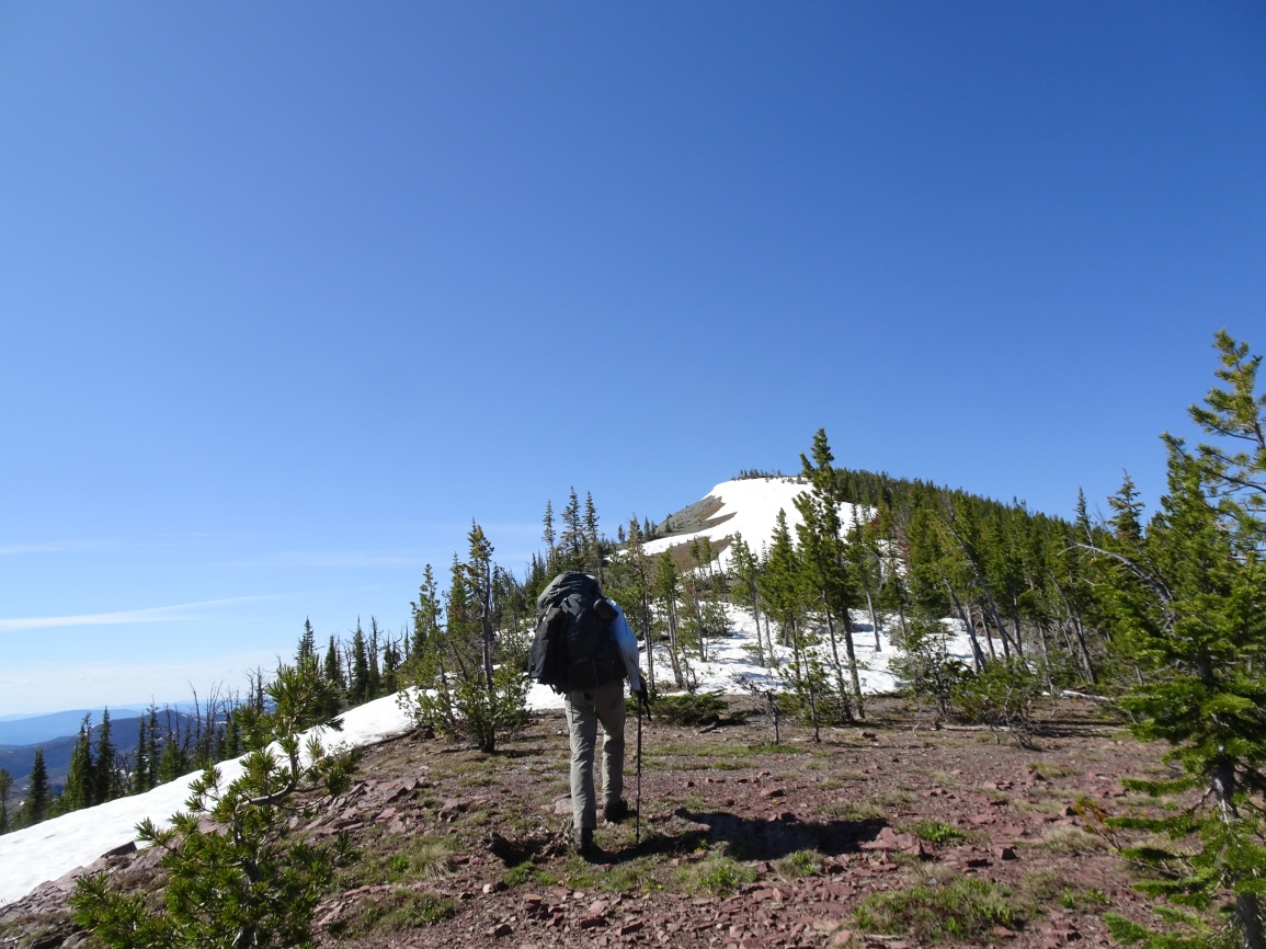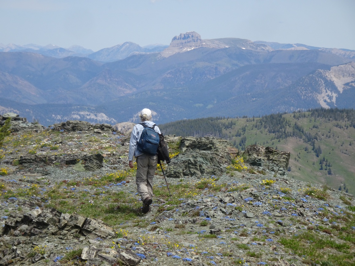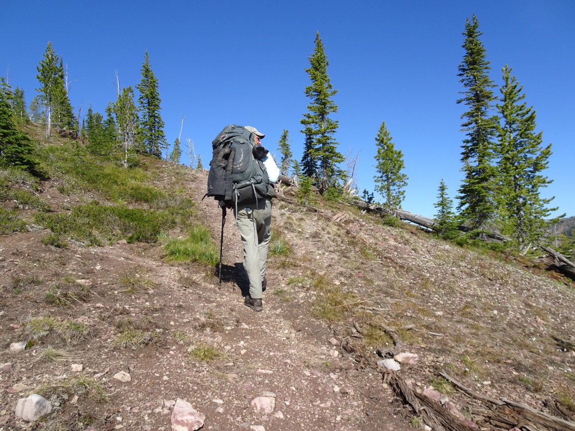 Hike north from the N. Fork Trailhead.  We turned left (west) on Tr. 061 (Lake Creek Trail) after about 0.6 miles to combine this summit with Spread Mountain (W7M/GA-079), but it is more direct to continue up the North Fork of the Blackfoot, and then turn left (west) up the Dry Fork after reaching the North Fork Cabin.  The trails up the North Fork and the Dry Fork are heavily used and get cleared early in the season.  Turn left (south) at Dwight Creek, cross the creek (it is a double crossing), then camp somewhere in the large sagebrush meadow area – there are many options.