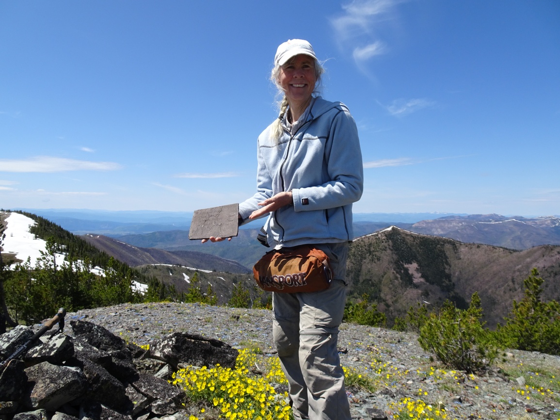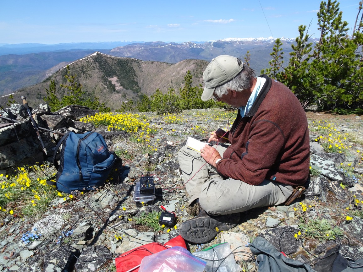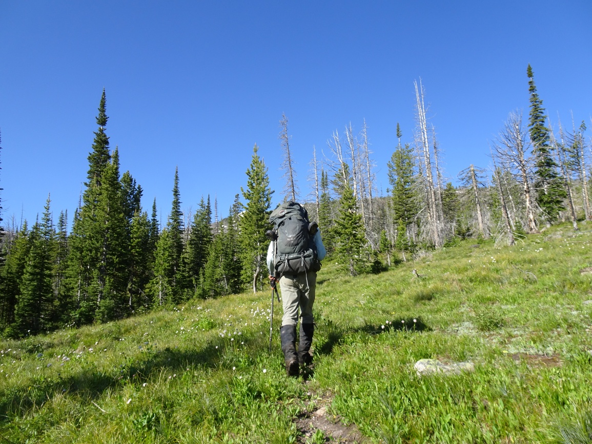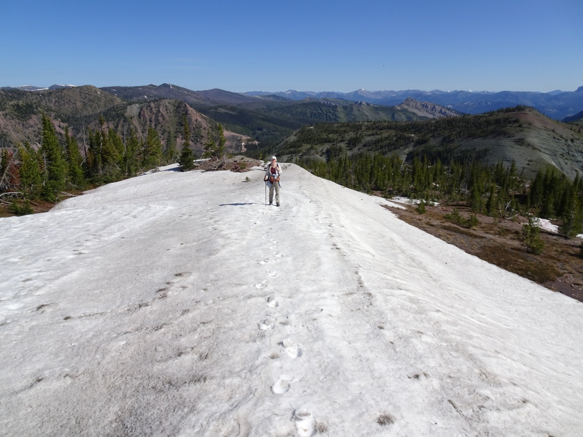 Hike north from the N. Fork Trailhead.  We turned left (west) on Tr. 061 (Lake Creek Trail) after about 0.6 miles to combine this summit with Spread Mountain (W7M/GA-079), but it is more direct to continue up the North Fork of the Blackfoot, and then turn left (west) up the Dry Fork after reaching the North Fork Cabin.  The trails up the North Fork and the Dry Fork are heavily used and get cleared early in the season.  Turn left (south) at Dwight Creek, cross the creek (it is a double crossing), then camp somewhere in the large sagebrush meadow area – there are many options.