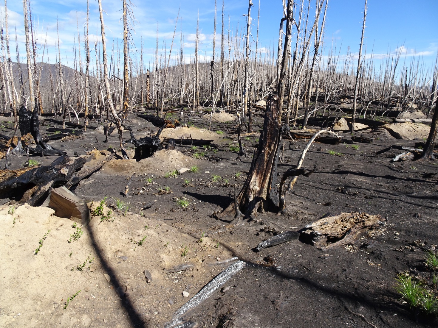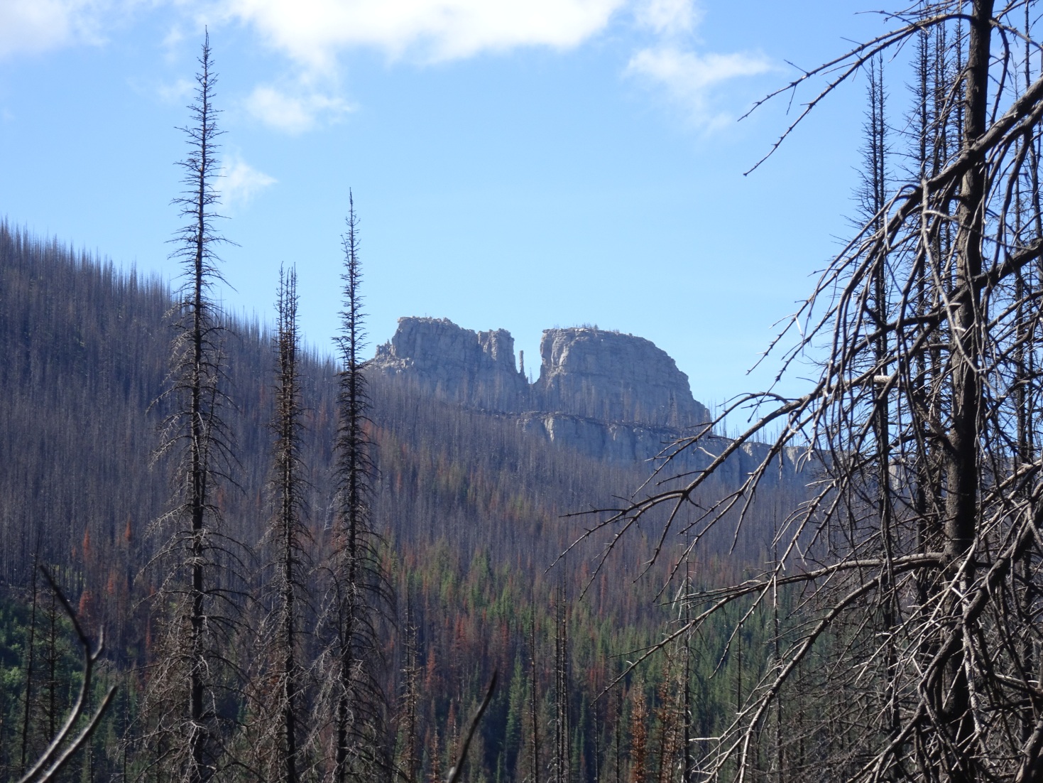 Hike 0.72 miles from the Silvertip Trailhead to the Dean Ridge trail. Take the Dean Ridge trail up to near the ridgetop. The trail enters the 2015 Trail Creek burn just before the crest of the ridge. The burn made for rough going in 2016 – it appeared that we were the first to pass through. There was lots of deadfall and the trail was extremely difficult to find and follow in several locations. Follow the trail to the saddle near Gunsight Peak and ascend off trail to the summit. There is little camping along the route, although it should be possible to camp near Gunsight Lake. Gunsight Lake is also in the burn but there are some spots that are less burnt than others. Watch out for “standing dead” – especially if it is windy. Gunsight Lake is below the aptly named “Gunsight Rock”.