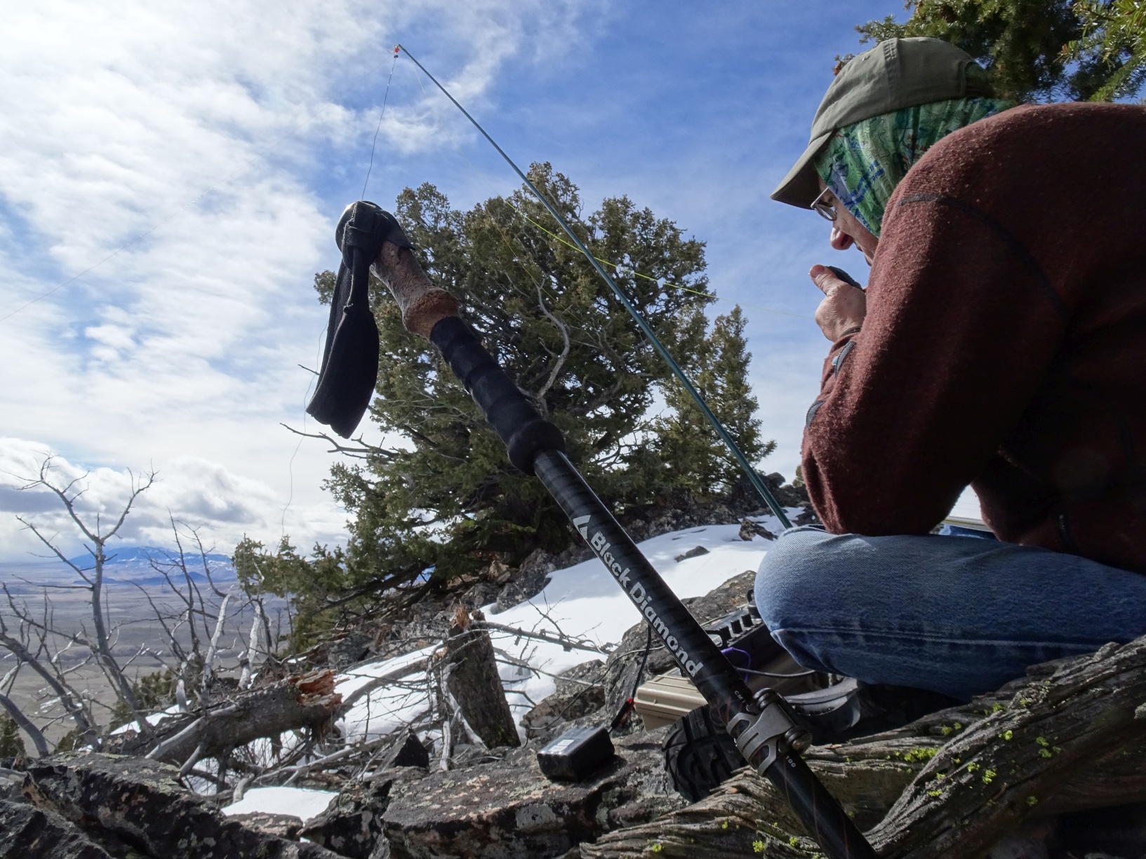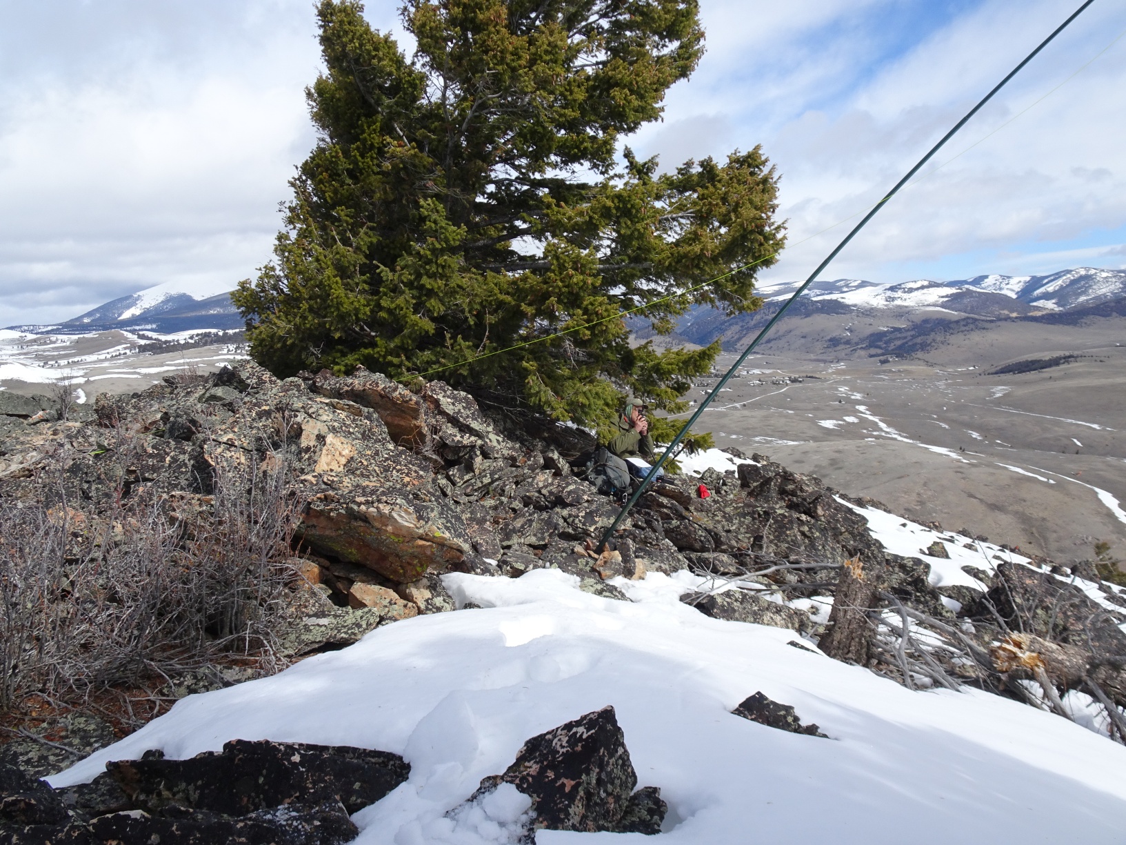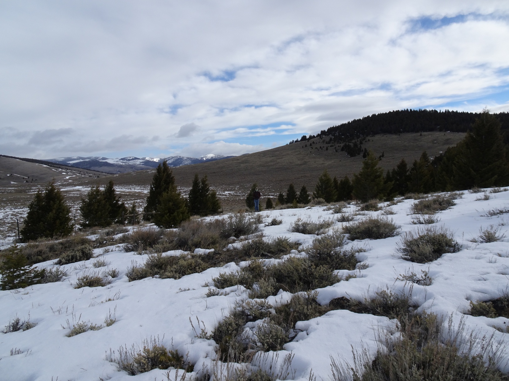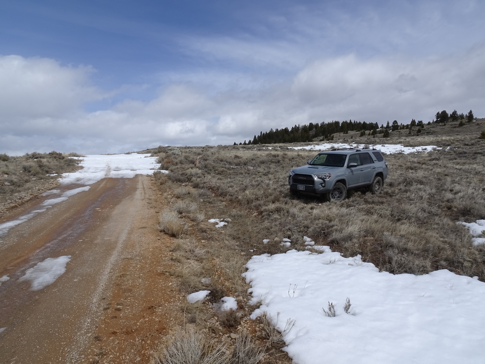 From I-15 (Exit 59 to Bannock) South of Dillon, drive west 13.8 miles on Hwy 278 and exit right onto the Taylor Creek Road. Follow this 0.4 miles and turn right (north) on the Badger Pass Road. We were only able to drive about 0.7 miles before the road was blocked by snow, but driving 2.0 miles would make the hike shorter. There is also a road junction at the 2.0 mile mark that is likely open to motorized use and would allow one to get even closer to the summit, but this should be verified. The hike is, in any case, a short one over rolling open sage country except for the final 400-feet to the summit, which is a steeper ascent through open forest. The Badger Pass road is suitable for all vehicles.