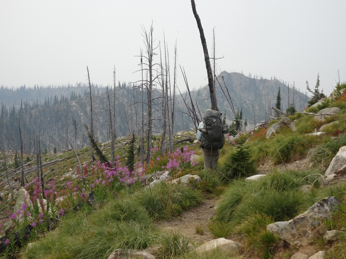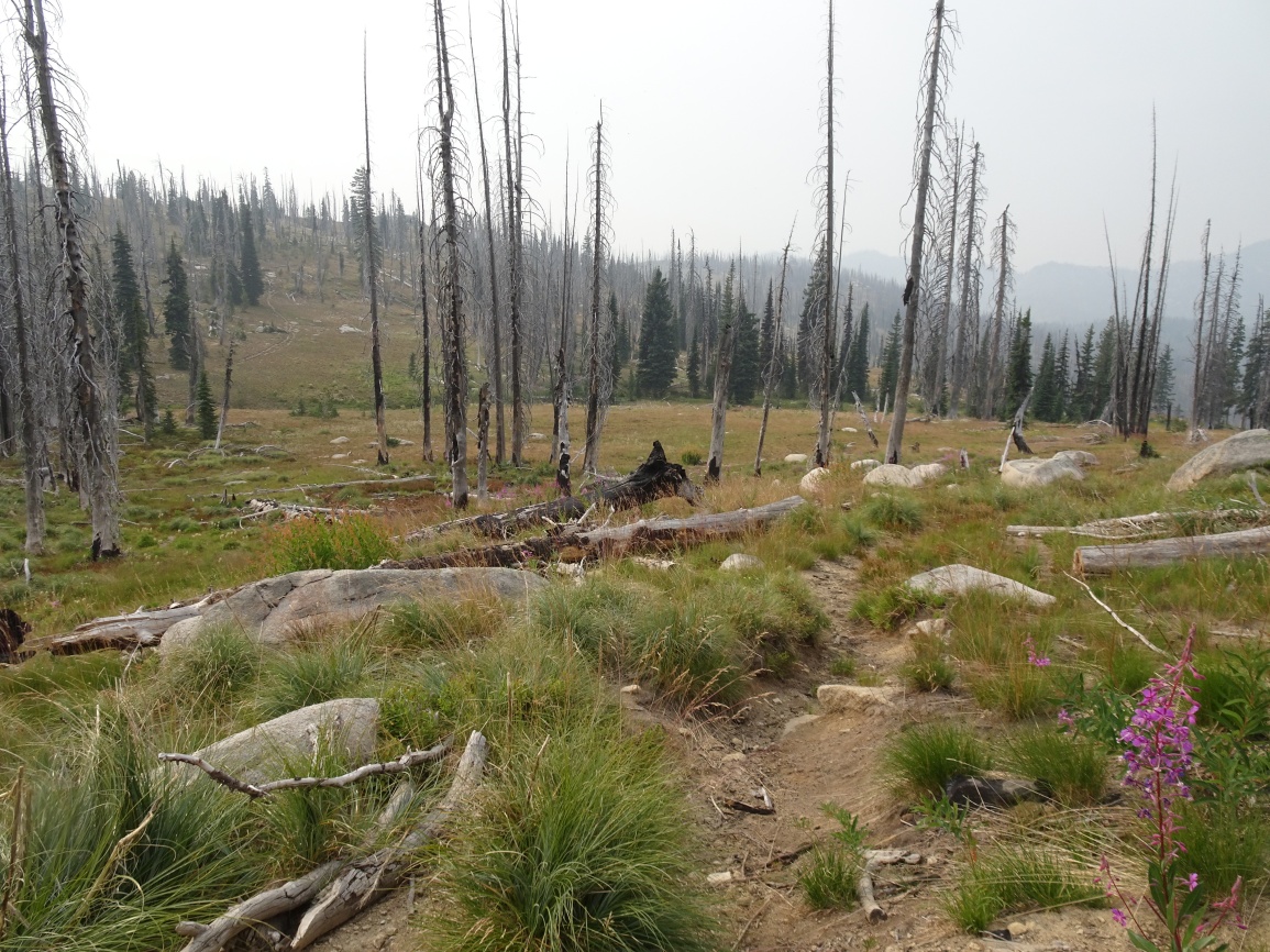 The trail is very well maintained and leaves from the east side of the parking lot.  Follow the trail over the shoulder of Elk Mountain, then down its north ridge through a pretty meadow, and onwards as it descends towards Bilk Mountain.  The trail switchbacks steeply down the east side of the Elk-Bilk ridge, then contours around the south slopes of the Bilk SE-Ridge before climbing back up to a trail junction in the saddle on the southeast ridge of Bilk.  Turning left at the trail junction will take you to Bilk Mountain.  Continue over Bilk Mountain and down to Grave Meadow where there is water and good camping.  Most of the area between Bilk Mountain and Indian Park is in the 2017 Buck Lake Creek burn.  Peak 7540 is in the 2003 Pack Creek burn.