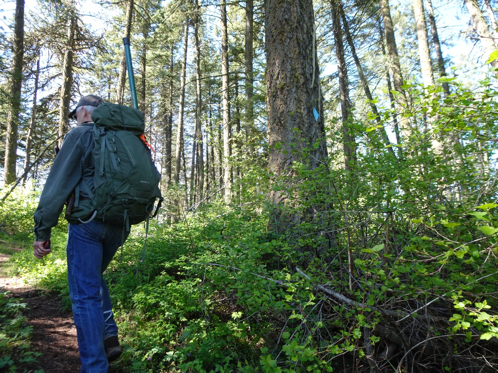 Option-2: Although we did not do this, the summit can be ascended via the two-track roads on a grade that is likely mild and steady. These would likely be the preferred routes if climbing with skis in the winter. It appears that the optimal winter trailhead may be about 0.5 miles further south than the turnoff to the park offices - just south of the Puffer Butte Lodge. The two-track roads (aka ski trails) are marked as solid lines on the Field Springs State Park map.