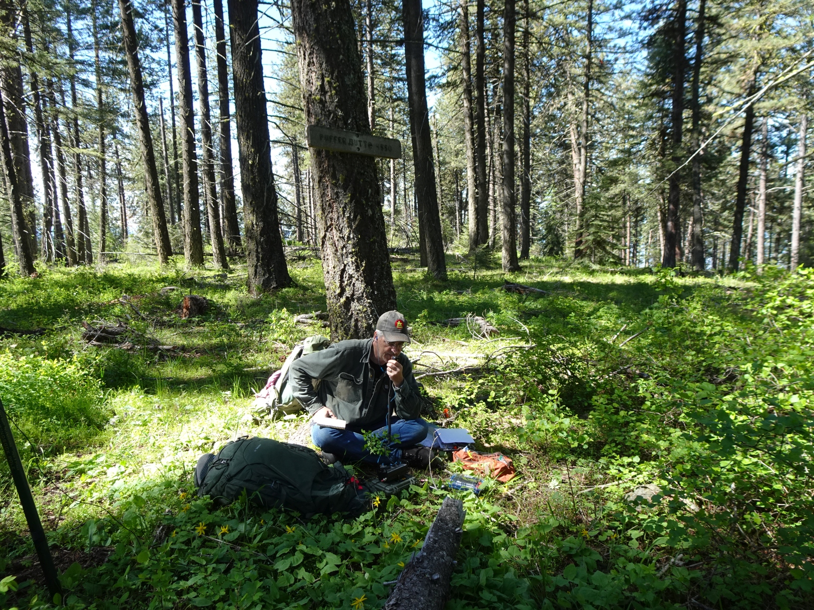 Option-1: This is a nice forest walk up the north side of the Butte. It is also likely the most efficient path to the summit. Park in the large parking lot and hike up the signed trail that leaves from the southwest side of the lot by the large signs. The trail intersects a two-track road at elevation 4,100. Continue straight across the two-track on the footpath. The path will climb at a steady rate before cresting out on the ridge. Once the path crests out, it continues another 0.3 miles before it passes below the summit (the summit will be a short distance west – to your right). While it would be easy enough to go off-trail directly to the summit, we chose to continue a short distance further south to the sign in a large open meadow, then double back to the north to the warming hut, and beyond to the summit (which is a short distance off-trail). There is a wooden “Puffer Butte” sign nailed to a tree at the true summit. Note that the sign in the large open meadow (north of the warming hut) is at the junction between the trail that we ascended up the north side, and an alternate trail on the east side of the butte that descends to the Puffer Butte Lodge. This path is not as heavily forested and has nice views to the east. The foot trails are marked as dotted lines on the Field Springs State Park map.