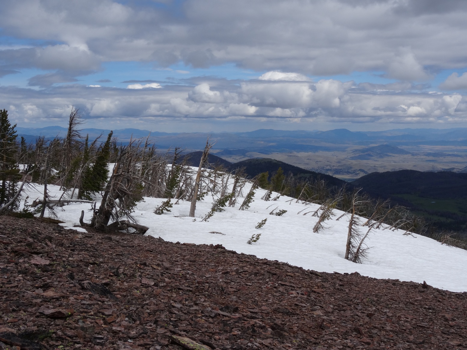Drive south from Rimini on the Banner Creek Road. The trailhead is 0.3 miles past where city flume crosses under road (above the switchbacks). The road is suitable for 2wd vehicles. Park on the west side of the road in a small unmarked parking area. The Trail begins on the south side of the small creek that drains the valley on the South side of Red Mountain. Follow the trail as it crosses the creek, passes between some old mine buildings and begins ascending the heavily forested valley. The trail will parallel the creek through forest and eventually break into a more open subalpine basin, where it leaves the creek and begins winding up the lower slopes of Red Mountain. Continue following the trail as it cuts up a talus slope and then finally ascends up a steep gully to the Red Mountain Ridge. The trail becomes very faint as it climbs the gentle, broad forested ridge to the summit. The summit is an expansive, open dome of red rock that provides ample space for any imaginable antenna configuration. The trail is 2 miles, with 1,700 vertical feet. This is one of the finer trails in the Helena area. Expect some blowdown along the lower portions of the trail.