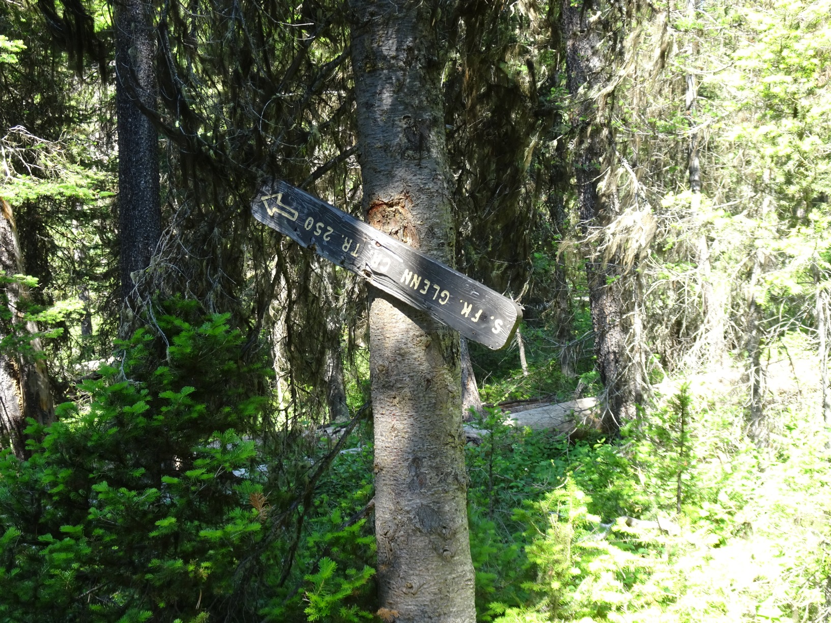 There is trail junction about 3.6 miles up the Bear Creek trail at about elevation 5,830. The junction was marked with the remains of an old USFS sign in 2021 but is not marked on some maps. While the official trail doubles back east before switchbacking to the west, it becomes very faint and is not well cleared. We found it much easier to bushwack straight up the hill about 100 vertical feet to a well-defined horse trail that parallels the Bear Creek Trail for about 0.3 miles before ascending to the Bear Creek – Glenn Creek saddle on the west side of Sheep Mountain. We turned left (west) shortly after crossing the Bear-Glenn saddle and continued up the south side of South Glenn Creek until we reached a good campsite, which we used as a base camp.