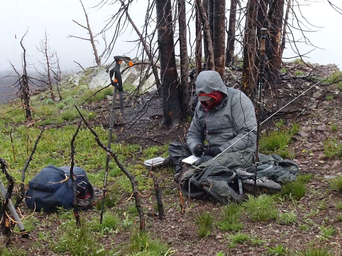 Hike north from the N. Fork Trailhead on the North Fork of the Blackfoot River and turn left (west) on Tr. 061 (Lake Creek Trail) after about 0.6 miles. The trail is well defined and gets cleared early in the season. Follow the broad Lake Fork Valley up about 2.2 miles to the shallow ford. Shortly after crossing the creek, the trail will begin climbing. There is a nice overlook of some falls on the West Fork of Lake Creek part way up. The trail climbs at a steady grade before leveling out around 6,200 feet in a beautiful open hummocky area that has nice views of the surrounding country. Soon the trail drops down to Lake Otatsy. Continue straight (left) at the trail junction at the outlet for Lake Otatsy and continue up past Camp Lake to Camp Pass on Tr. 16. The trail from Camp Pass (Tr. 166) is marked by a “trail not maintained sign”. It is much fainter, but generally follows the track on the USGS Quadrangle. Follow the tread where it is evident, and the mapped position on the USGS Quadrangle where it isn’t. There is some deadfall near the beginning of Tr. 166, but nothing particularly problematic. Leave the trail to climb the gentle north ridge to the summit. It is likely that there are nice view from the summit, but it was socked in when we were there.
