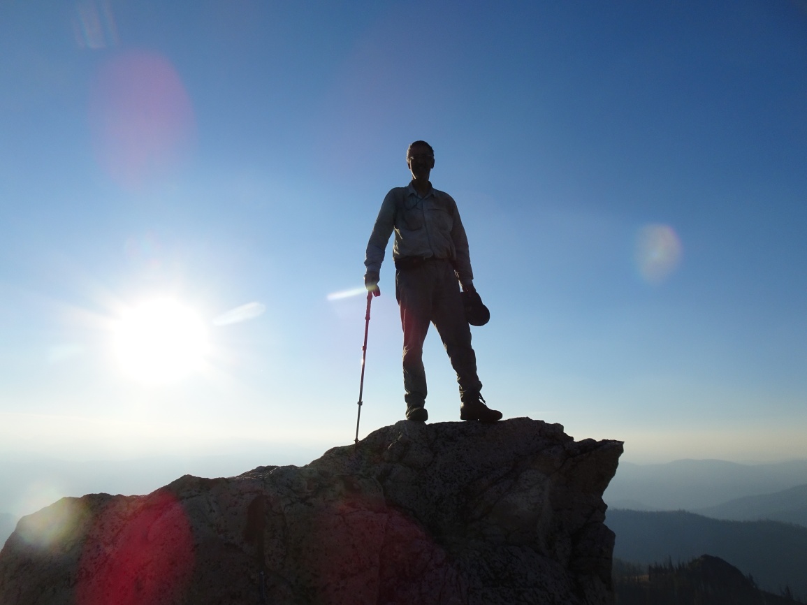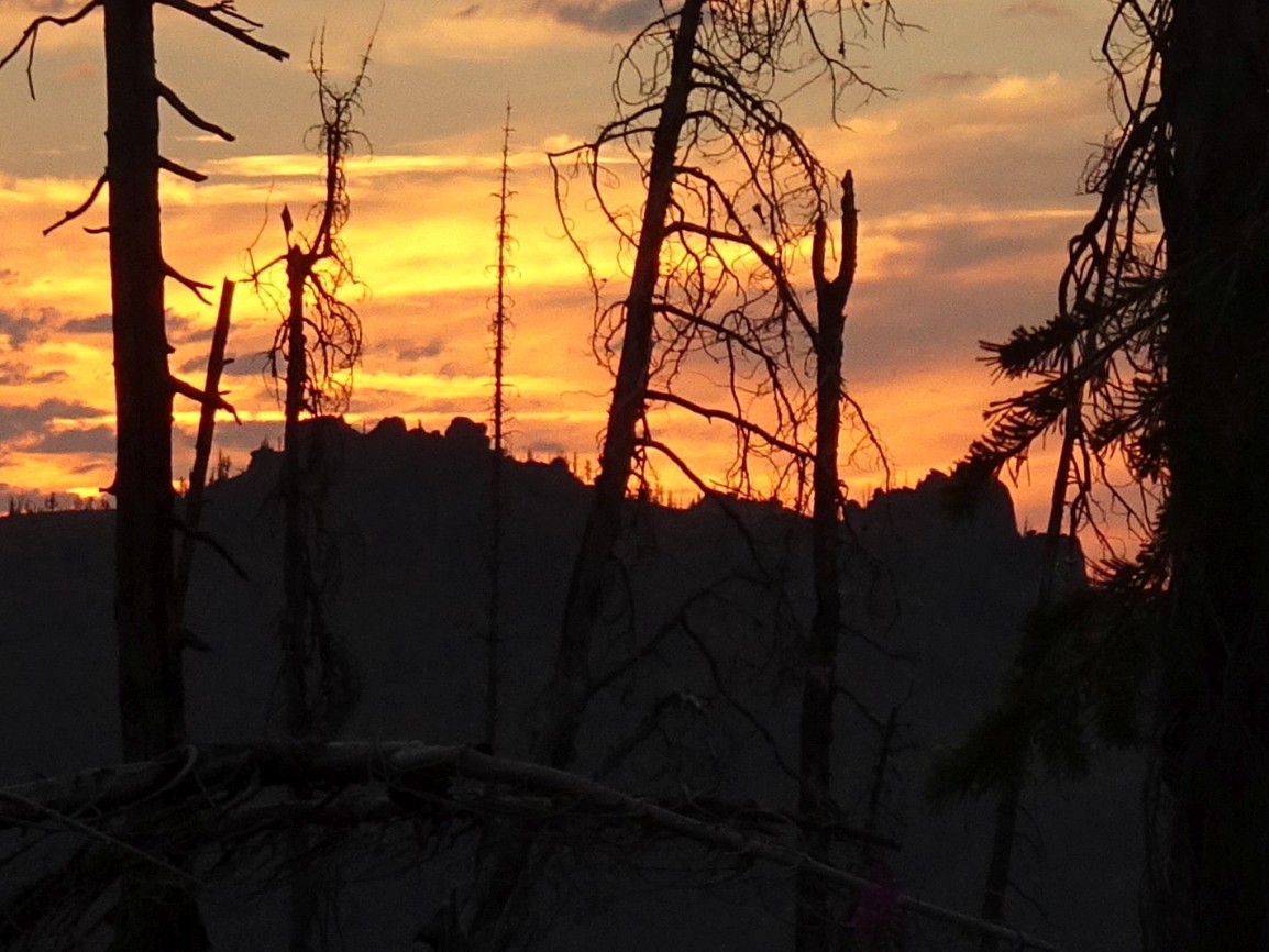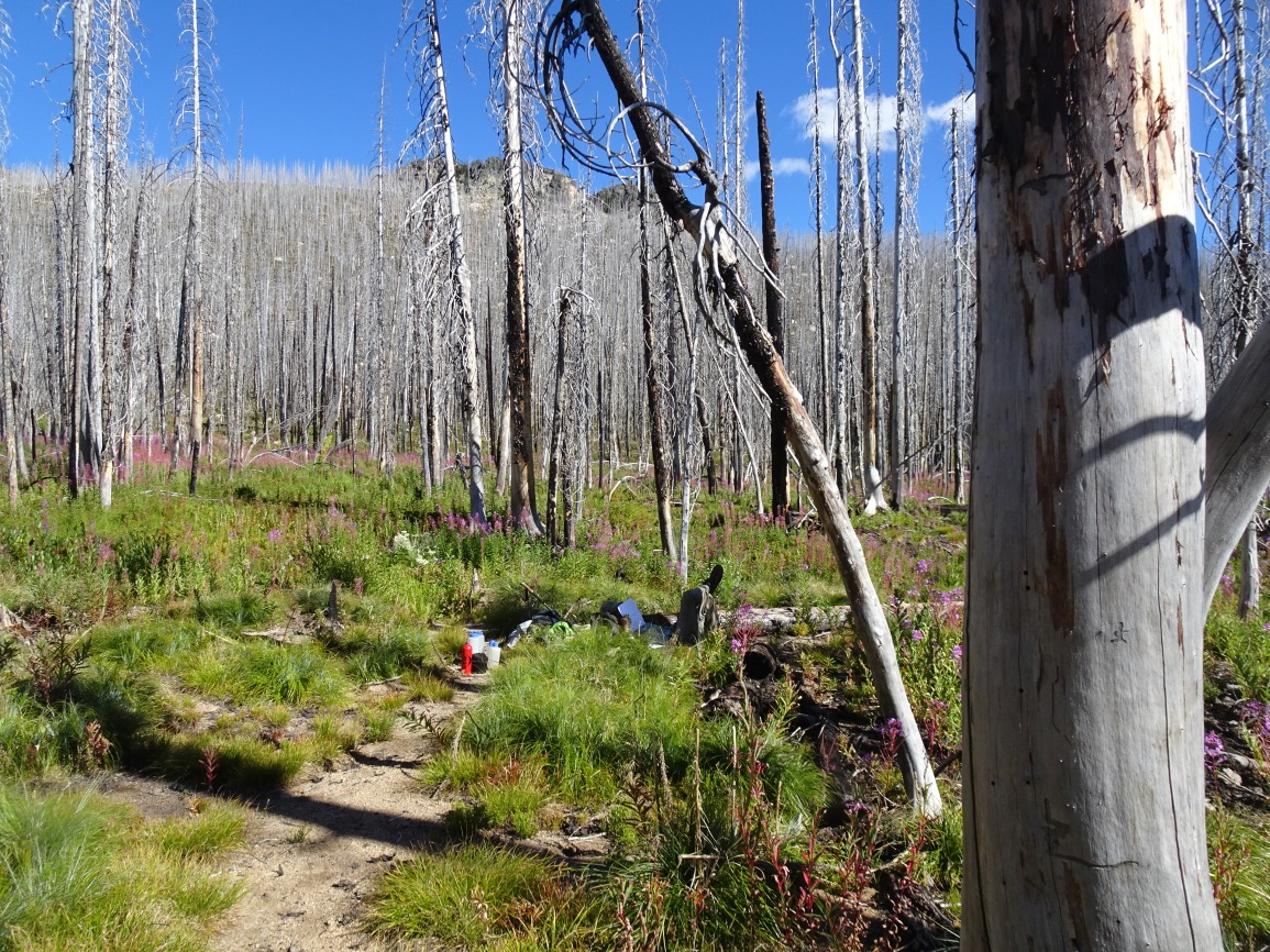 While we camped in a tiny semi-level spot within the unburnt timber just north of the 602/562 trail junction, it may be more practical to risk the standing-dead timber and camp alongside the nice stream that lies a short distance south down trail 562.  This area all burned during the 2012 Goat/Ballinger fire.  The trail up and over Wylies Peak is well maintained.  It is an easy scramble up the south side of the summit rock to reach the flat-topped summit where the old fire lookout used to stand.  The lookout was a log cabin cupola type that was constructed in 1925 and remained standing atop its spectacularly precarious perch until it was destroyed by lightning in 1983.  Take care not to drop anything, as it is a long way down the east side!