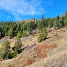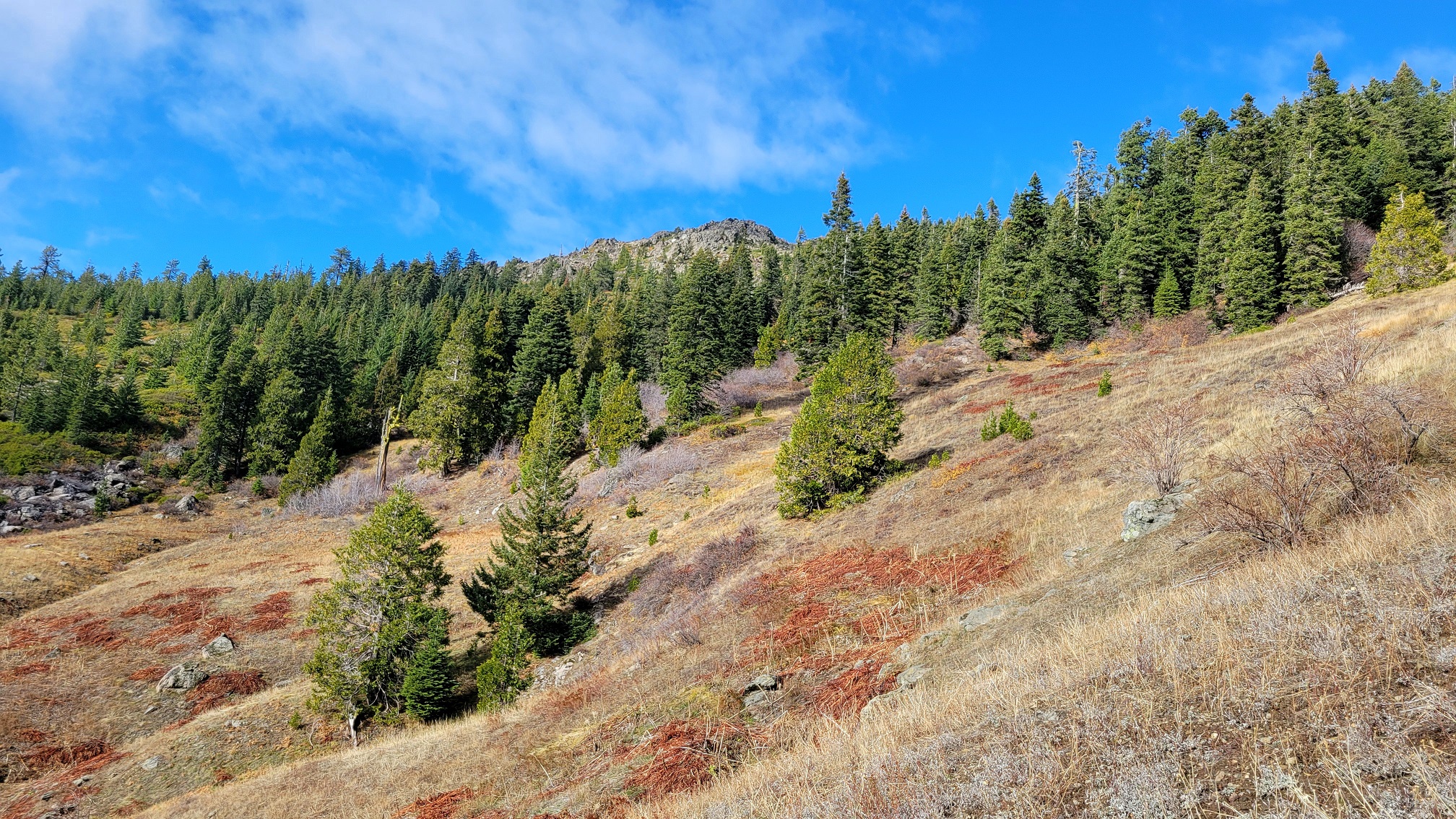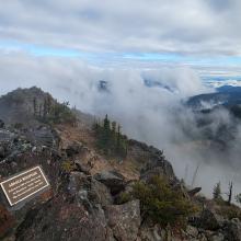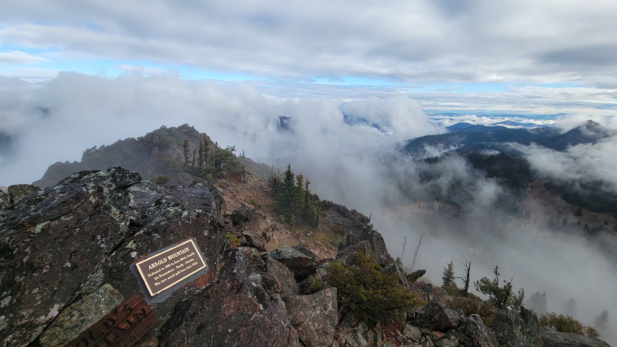 Take directions to Fir Glade TH and from the trailhead there is an old road, gated, to walk up. This will take you to the cabin area. From there, just start hiking up from behind the cabin/outhouse, it is pretty open meadow for a ways. It was so foggy I could not do much navigating ahead to avoid brush and found a down barbed wire range fence to use as a guide that goes most of the way up. There may be better ways, might even be a bit of a trail somewhere to avoid brush but I didn't find any. The hike is about 2.8 mi RT. I got pretty wet from the brush going up but the fog lifted just as I was setting up and it warmed and the view was spectacular.