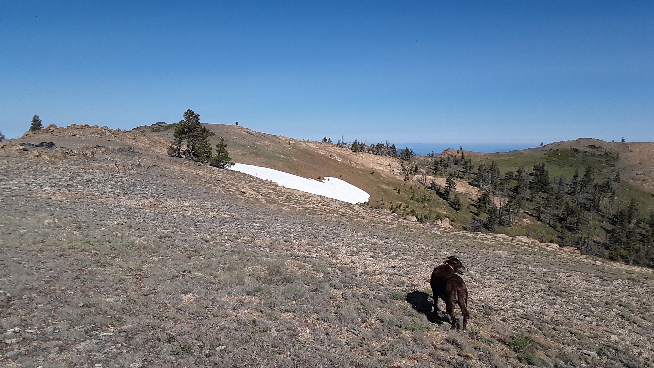 There are a couple ways to access Big Red. We chose going up from Talent to Wagner Cr Rd. to Wagner Gap. At the cattle guard turn left on NF Road 22 until you reach the intersection with NF Road 20, near Siskiyou Gap. Take NF Road 20 right (west). This road can be pretty rough at times. Have good tires, a spare, and higher clearance may help in some areas. You can also come from Beaver Creek Rd./FS Rd 20 on the Applegate Lake side. This may be longer for some but you can avoid a lot of rock crawling from Siskiyou Gap to Big Red. We turned at jeep road FS 40S29, parked at ridge and followed a makeshift trail to the summit ridge. This road is sometimes closed with boulders but if so it won't increase the hike too much especially if you choose to hike up the south meadow front from Rd 20. Currently the trail from 40S29, has many cut rounds along the trail that FS left from 2018 Hendrix Fire. I would not recommend going further toward the west facing side to hike, as it is very rocky and steep, and probably not safe.